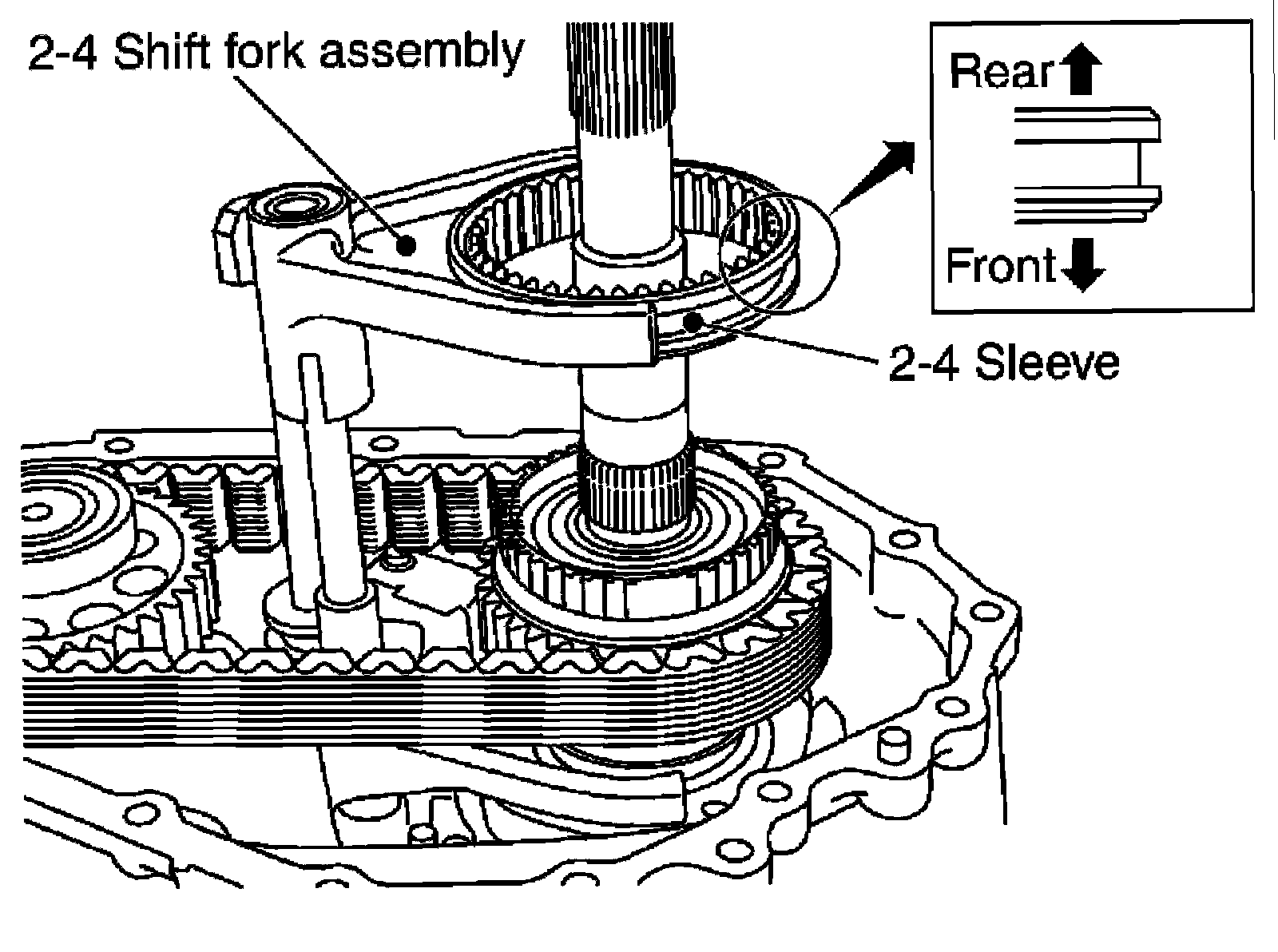 16) Install the 2-4 sleeve and 2-4 shift fork assembly to the mainshaft.