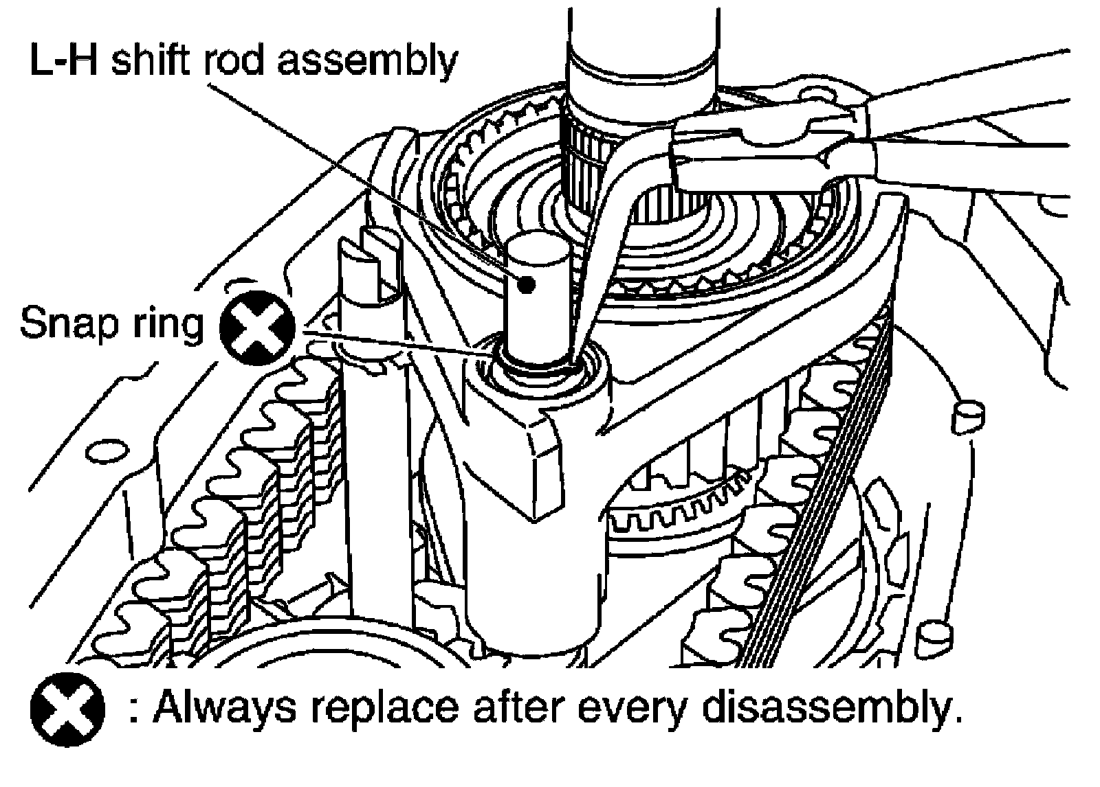 17) Install the new snap ring to the L-H shift rod assembly using suitable tool.