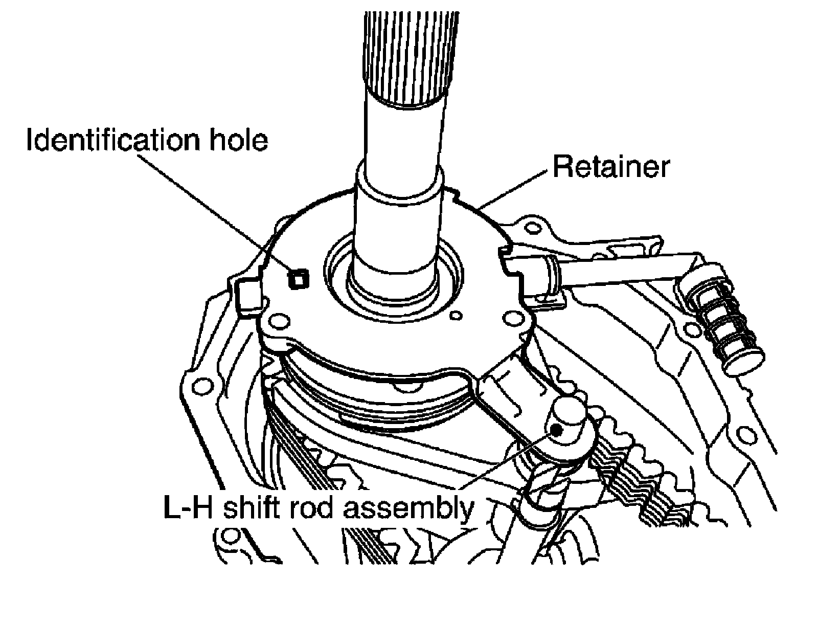 Set the projection of oil pump assembly to the identification hole, and then align locating hole of retainer to the L-H shift rod assembly.
