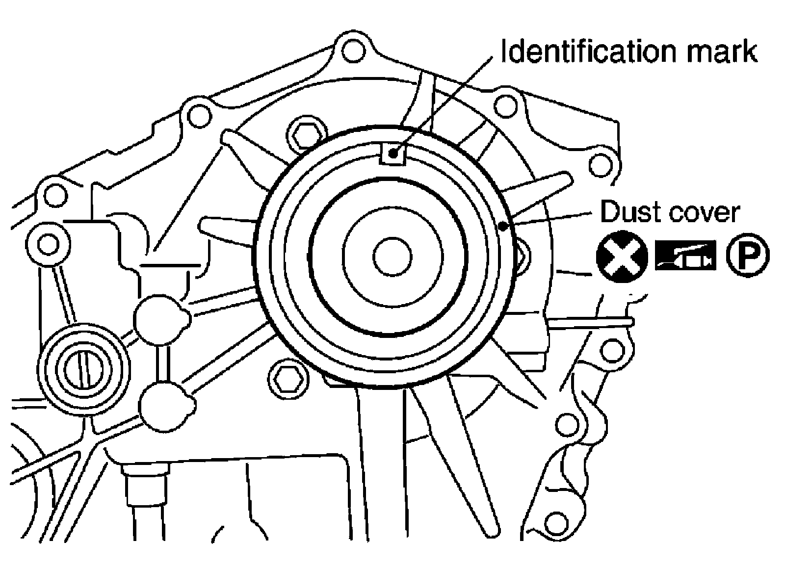 32) Apply petroleum jelly to the circumference of the new dust cover. Position the new dust cover using the identification mark as shown.