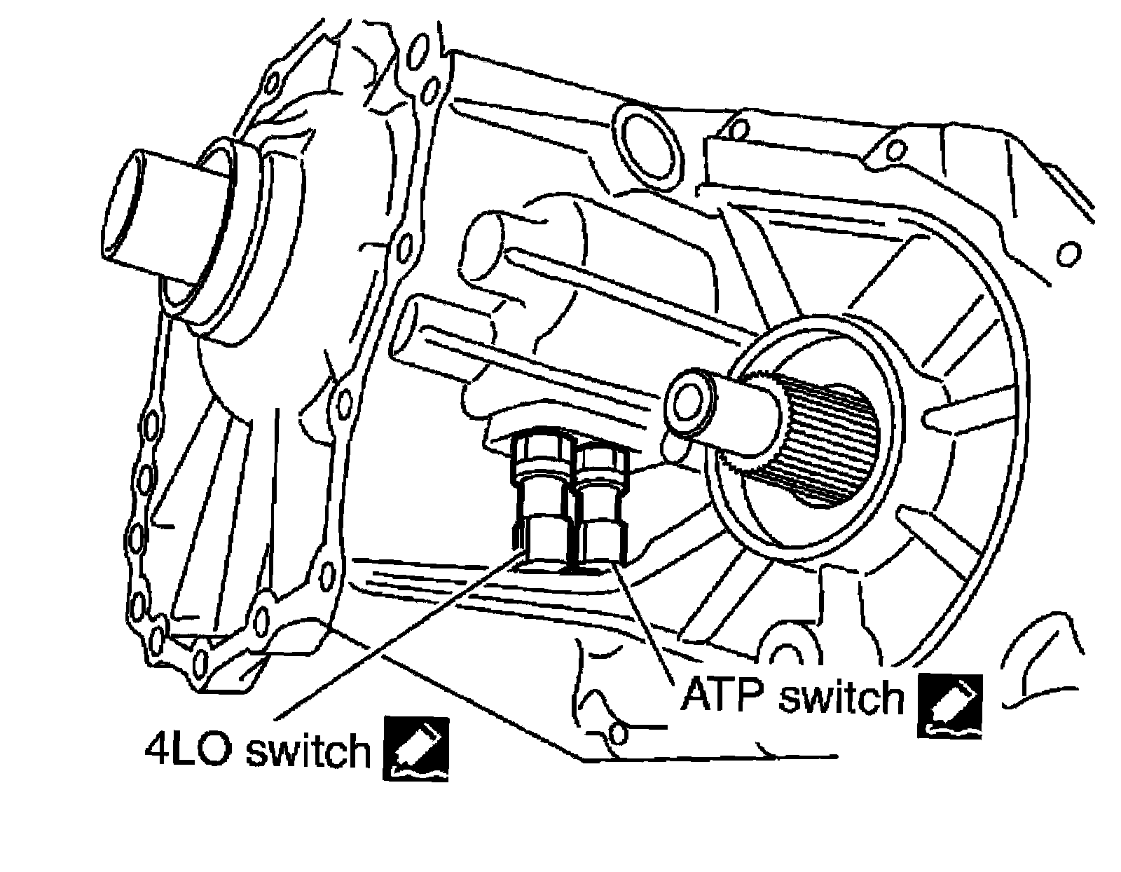 35) Apply sealant to the threads of the 4LO switch (gray with green paint) and ATP switch (black). Then install them to the front case and tighten to the specified torque.