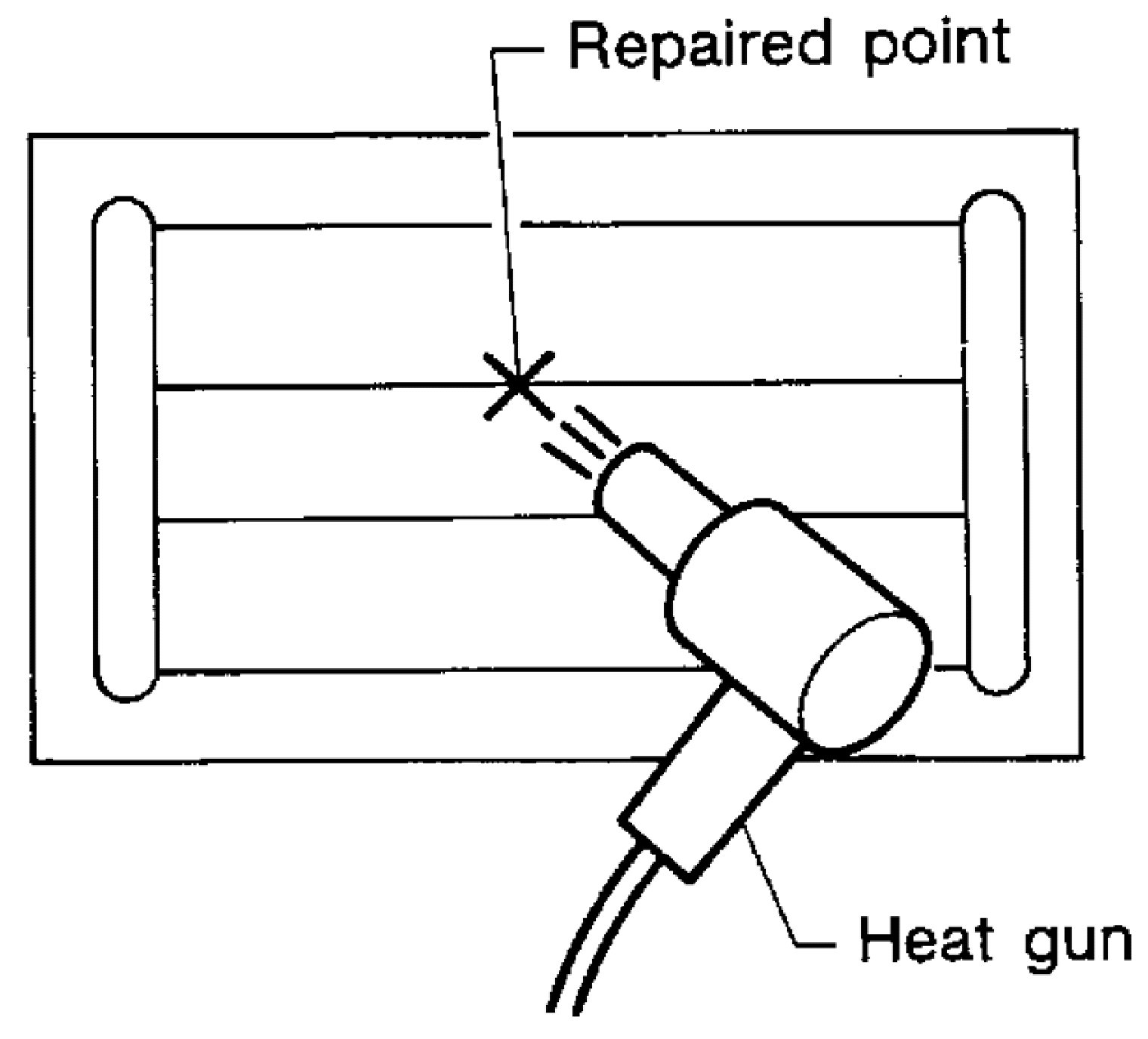 5. Apply a constant stream of hot air directly to the repaired area for approximately 20 minutes with a heat gun. A minimum distance of 3 cm (1.2 in) should be kept between repaired area and hot air outlet.
