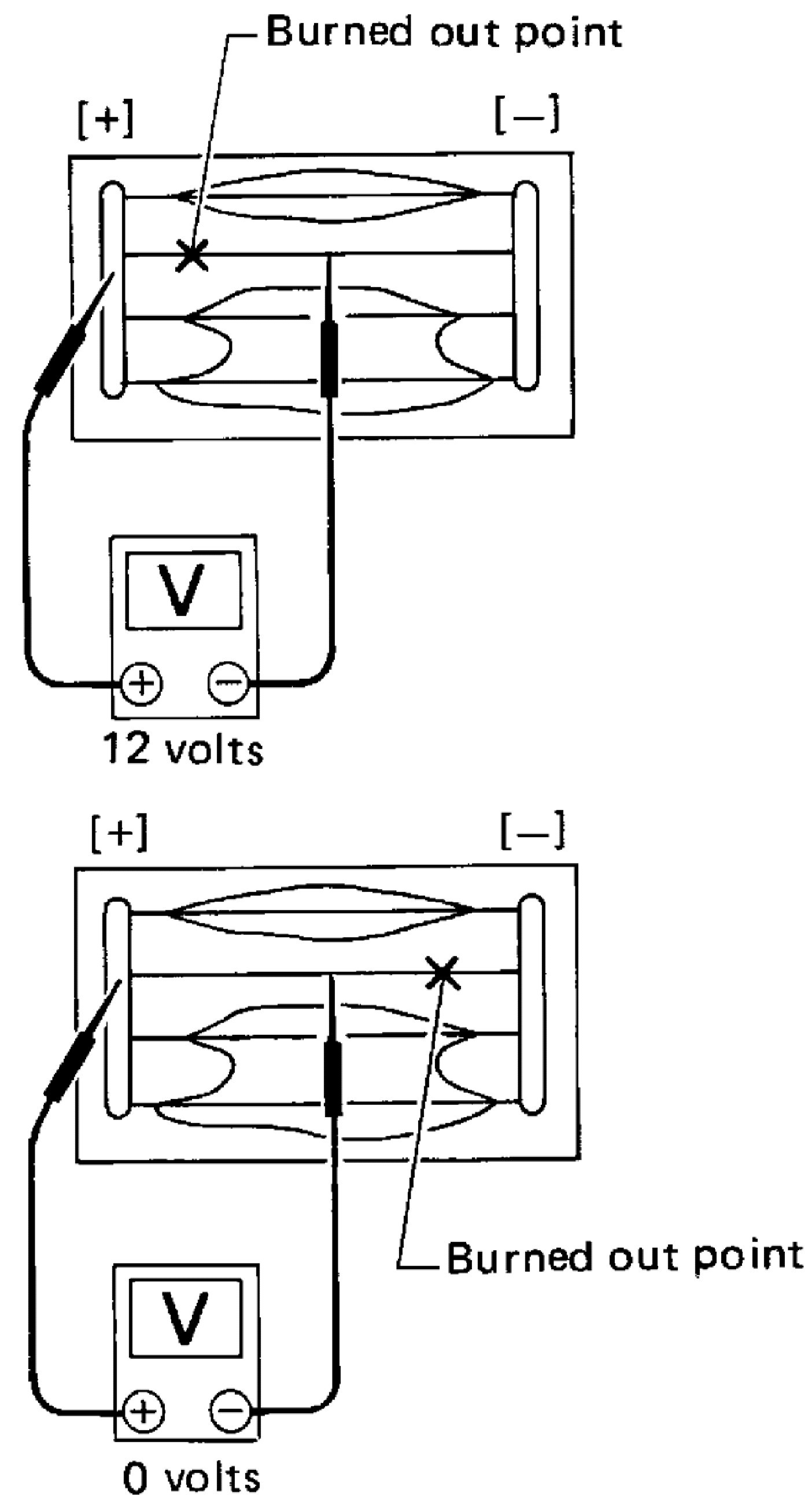 3. If a filament is burned out, circuit tester registers 0 or battery voltage.