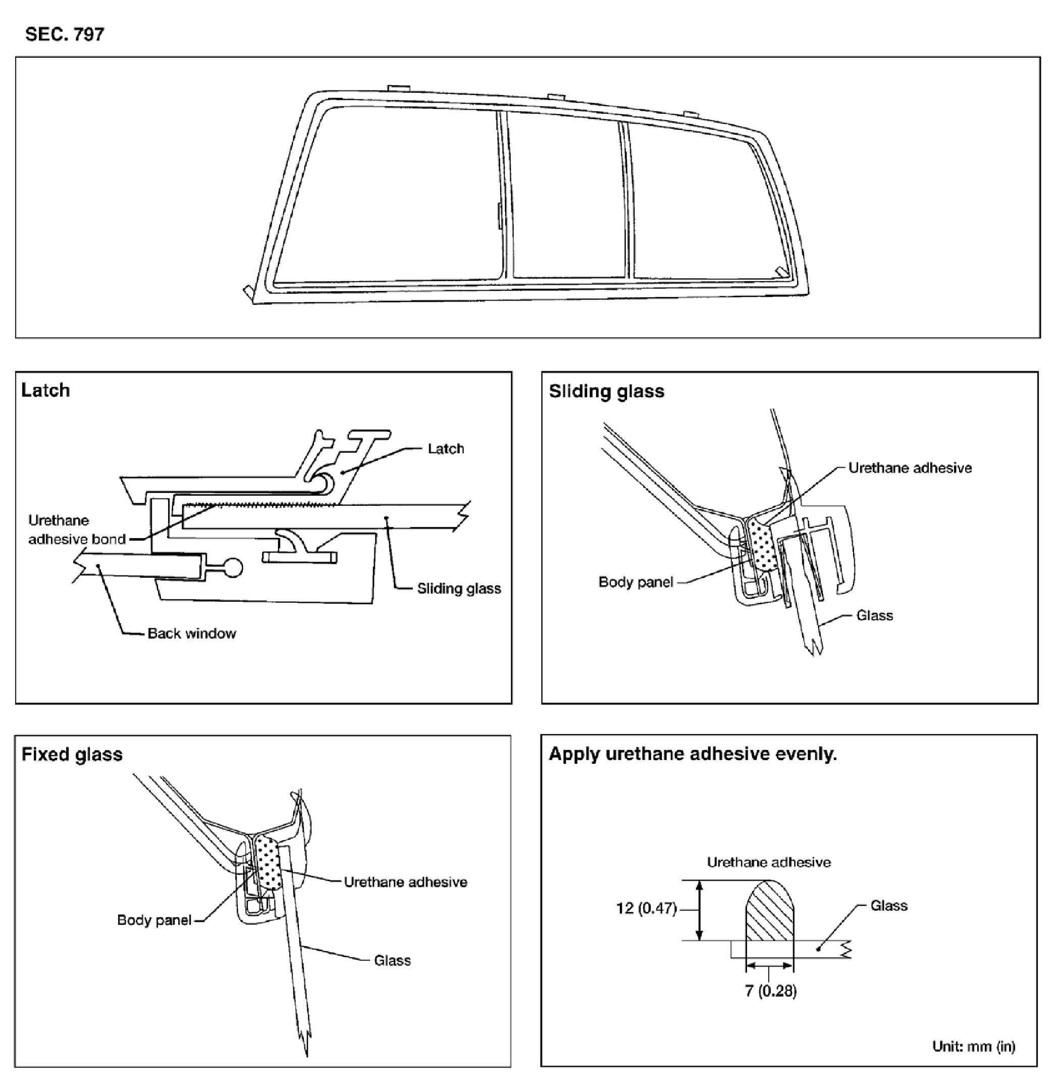 - Driving the vehicle before the urethane adhesive has completely cured may affect the performance of the rear window in case of an accident.