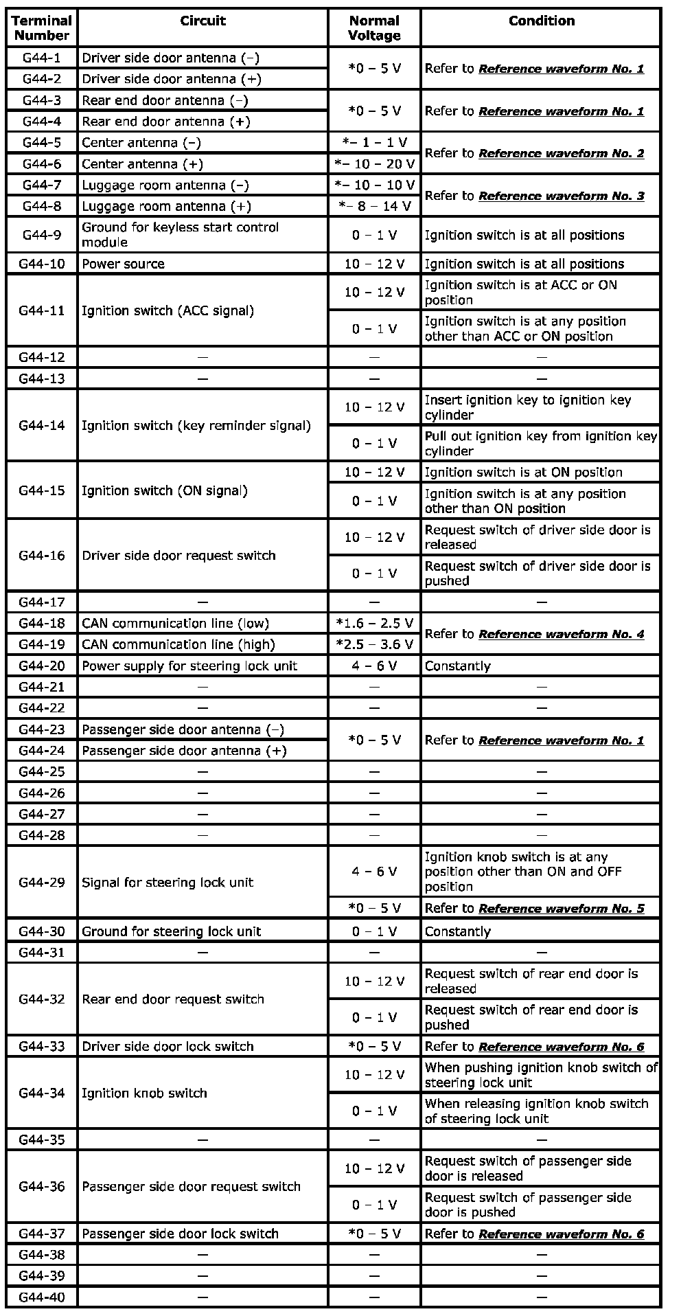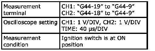 - As each terminal voltage is affected by the battery voltage, confirm that it is 11 V or more when ignition switch is ON.