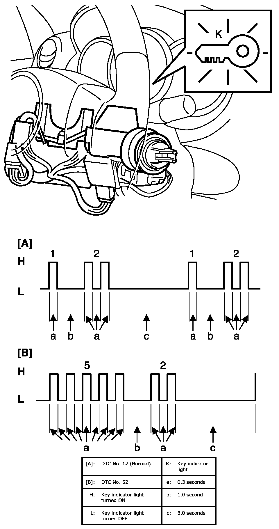 6. Read flashing pattern of key indicator light which represents DTC as shown in example below and write it down. When more than 2 DTCs are stored in memory, flashing for each DTC is repeated three times starting with the smallest DTC number in increasing order.