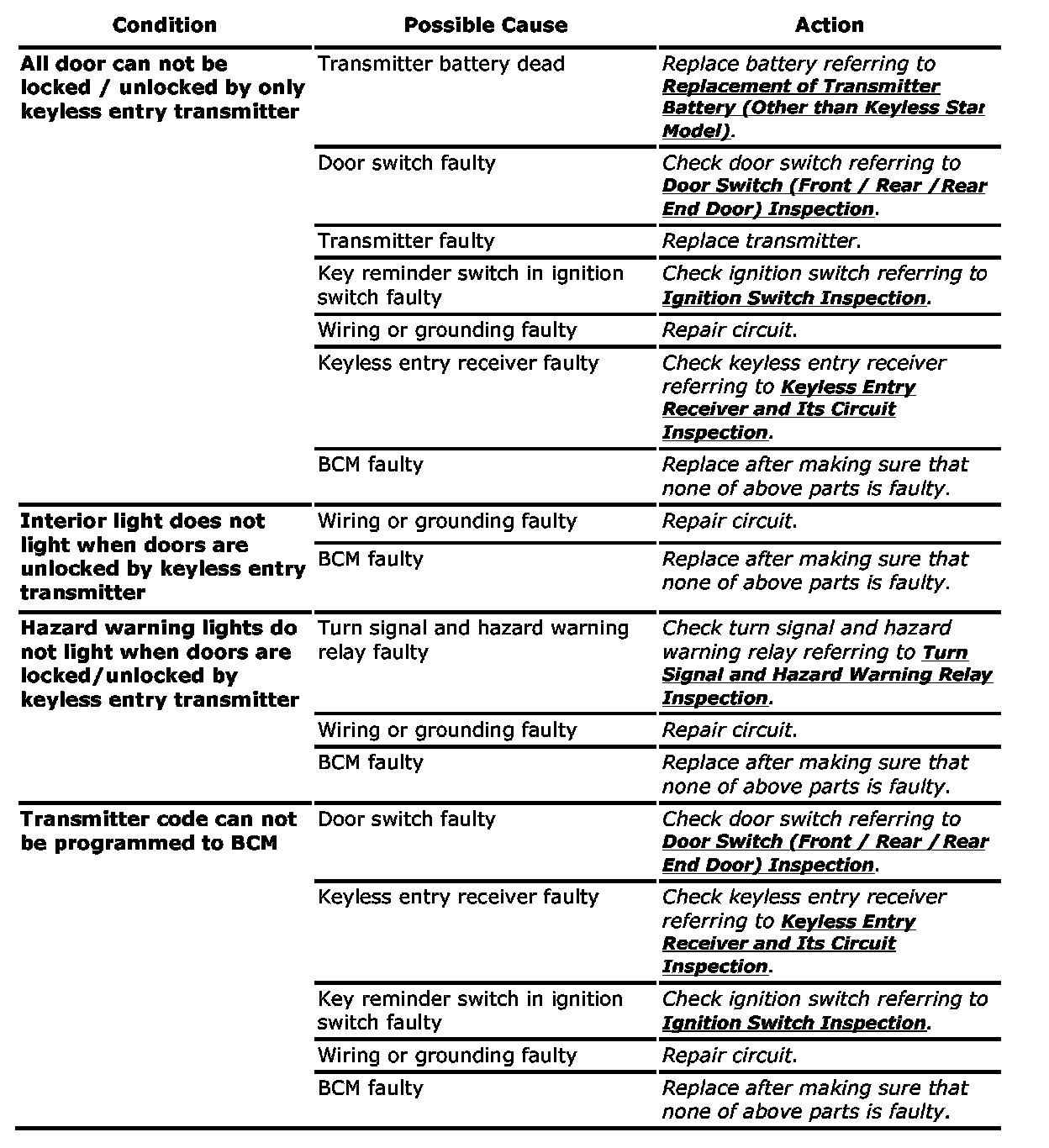 - Confirm that power door lock system is in good condition before referring to the following possible causes.