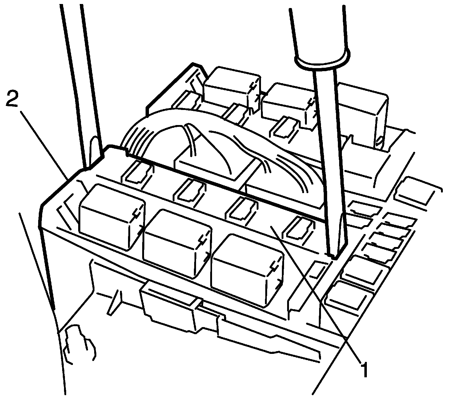 2. Remove door mirror heater relay (included in integration relay) (1) from main fuse box (2).