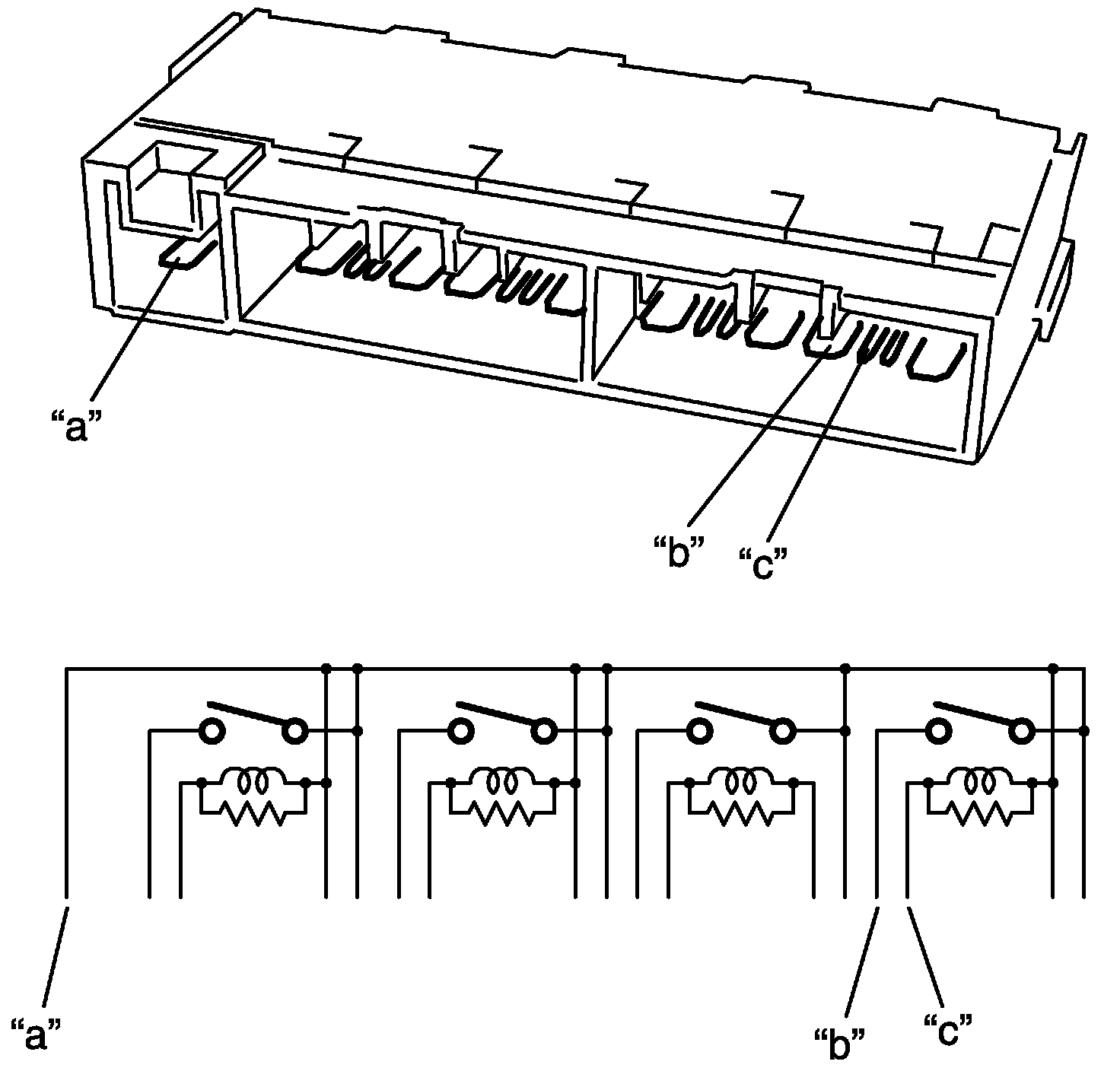 4. Check that there is continuity between terminals "a" and "b" when a 12 V battery is connected to terminal "a" and "c".