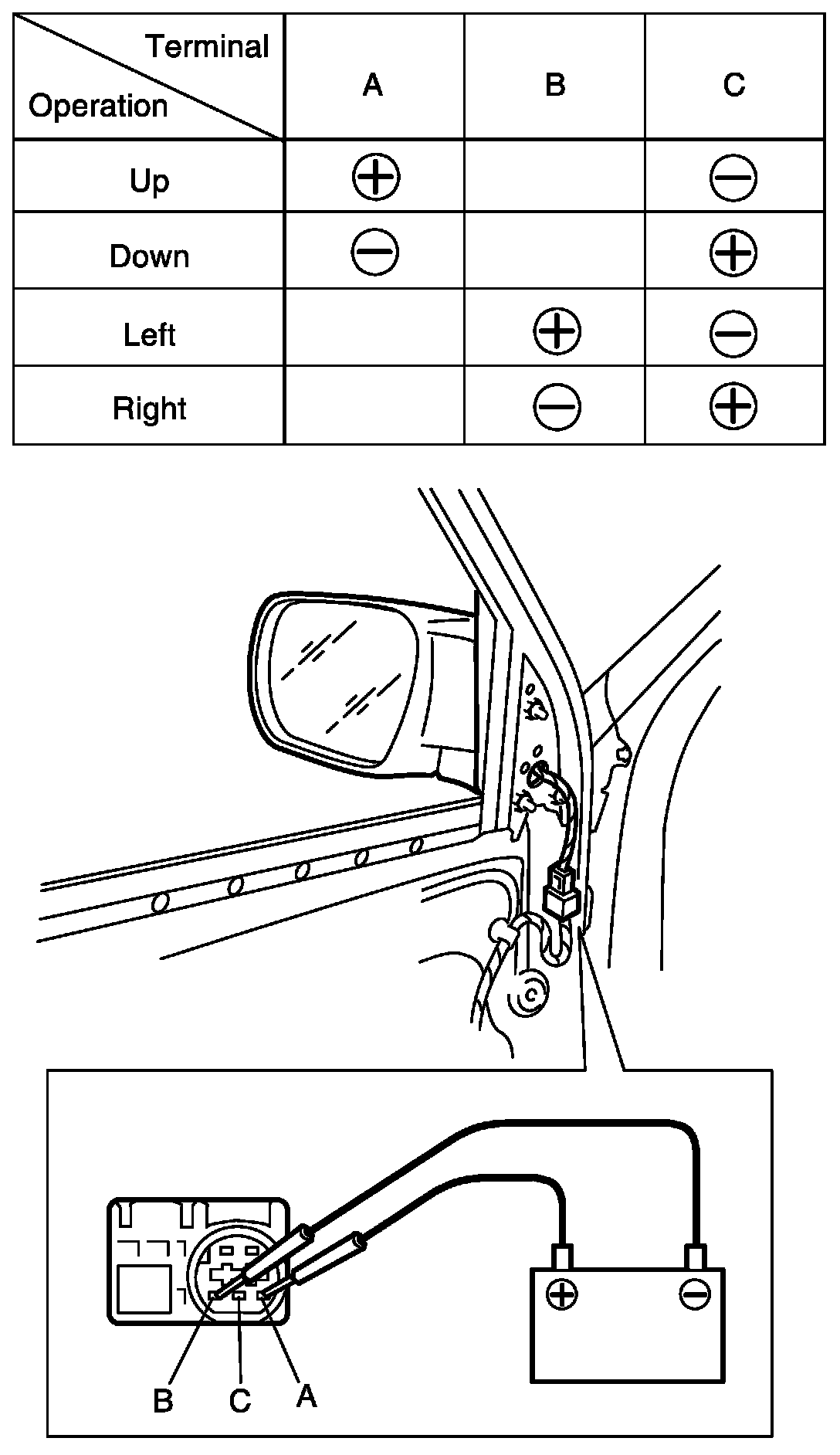 4. Connect battery positive (+) and negative (-) terminal to the door mirror terminals as shown.