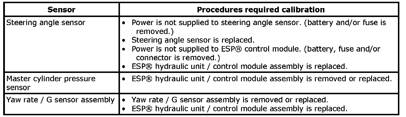 Precautions in Sensor CalibrationESP (R) control module stores calibration points data of yaw rate G sensor assembly and master cylinder pressure sensor. Steering angle sensor stores calibration point data of itself.