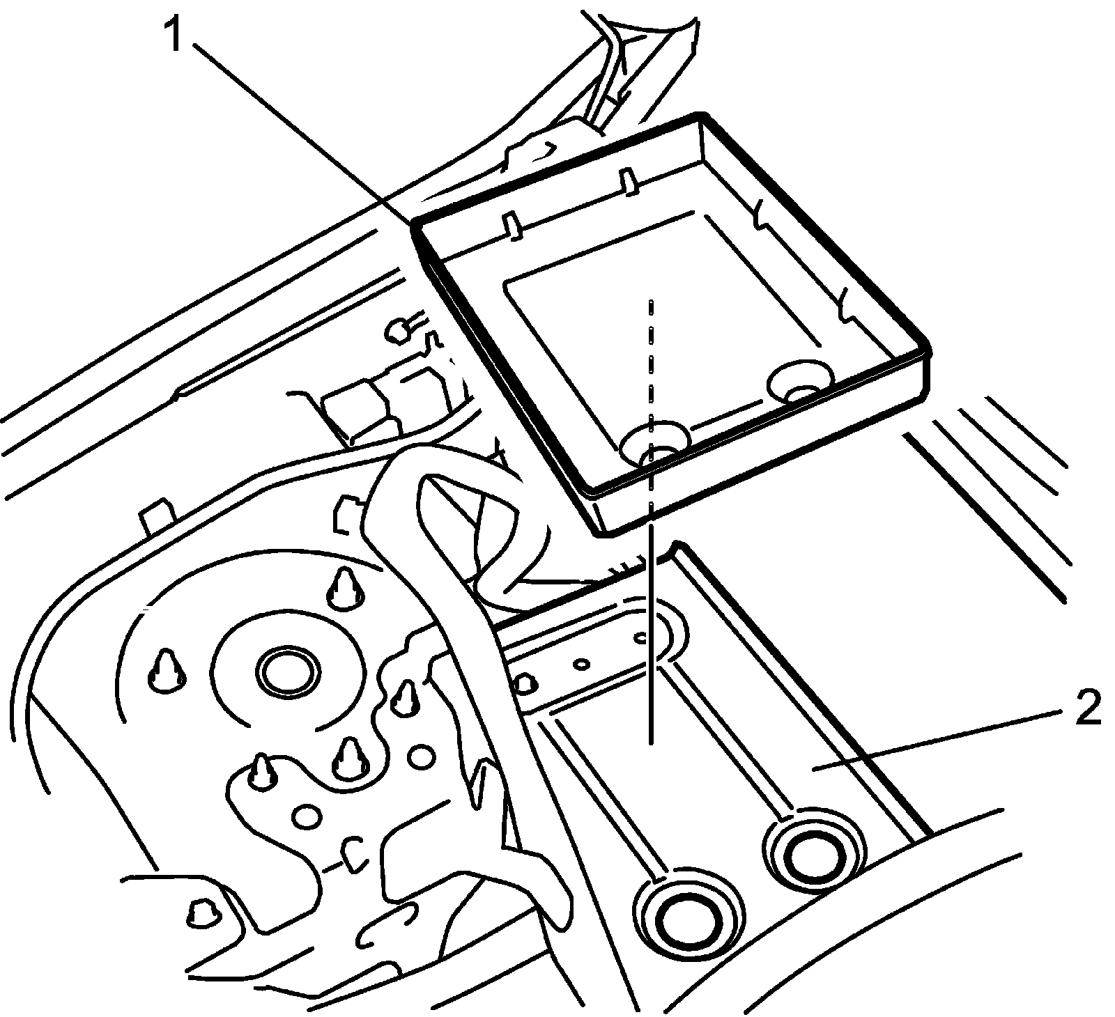 3) Remove battery tray (1) and battery bracket (2).