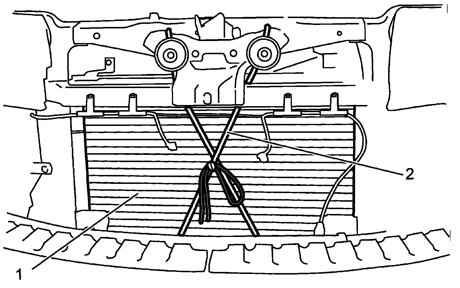 21) Remove radiator with radiator support bracket (1) and filler neck bracket (2) from vehicle body.