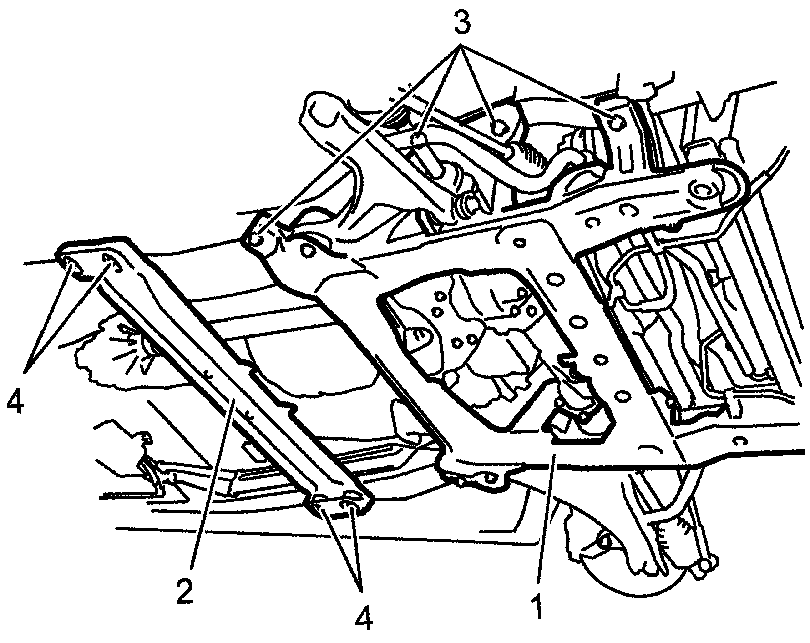 7) Tighten front suspension frame bolts to specified torque.