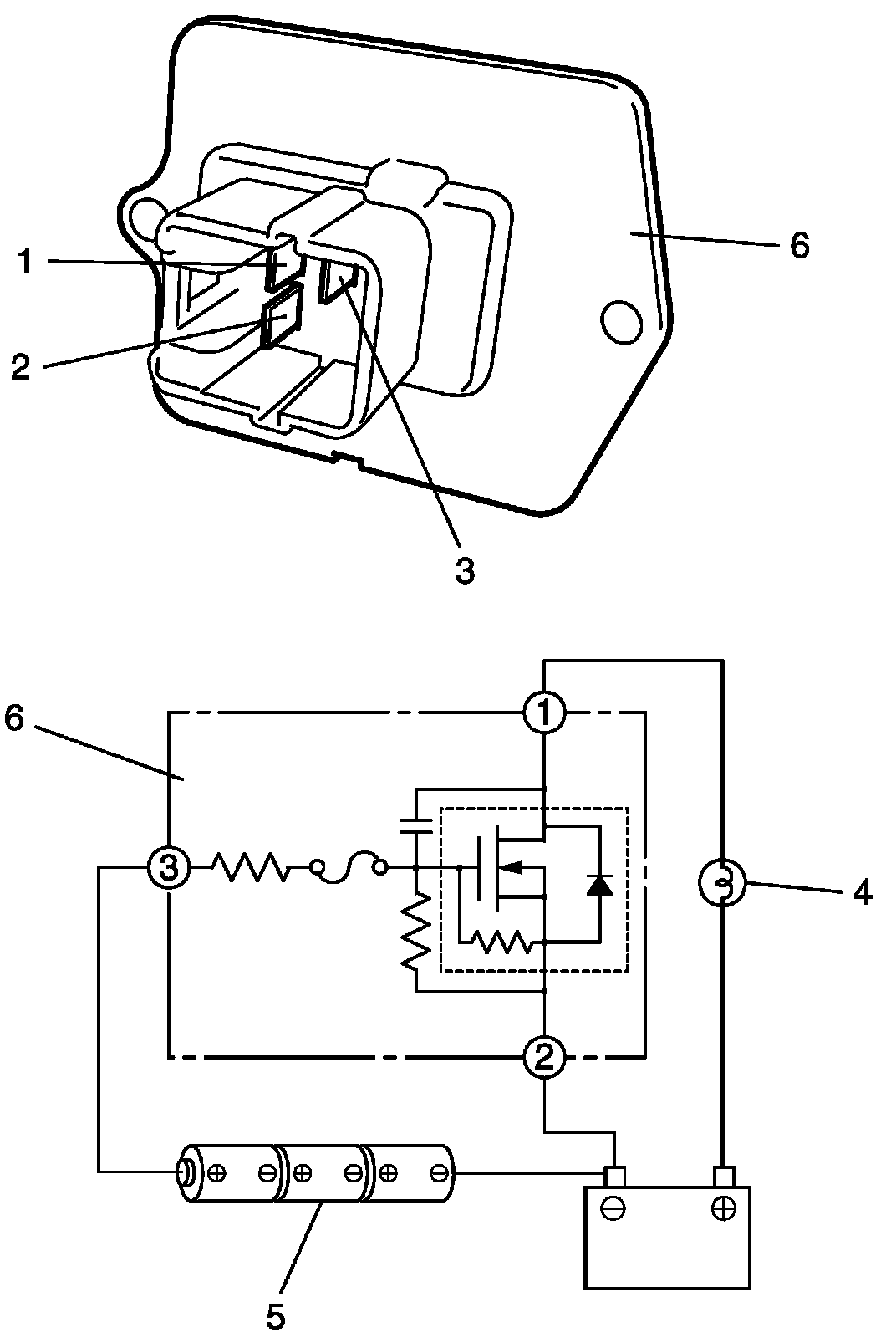 3. Arrange 3 new 1.5 V batteries (5) in series (check that total voltage is 4.5 - 5.0 V) and connect its positive terminal to terminal (3) of blower motor controller and negative terminal of 3 new 1.5 V batteries (5) to terminal. Then, check that bulb lights. If bulb does not light under the above conditions, replace blower motor controller.