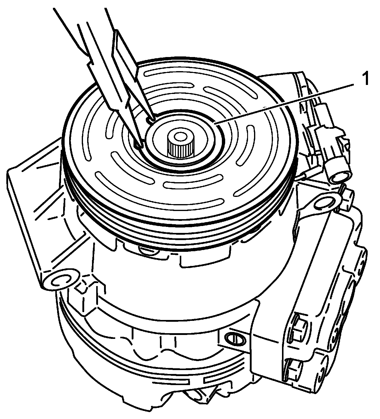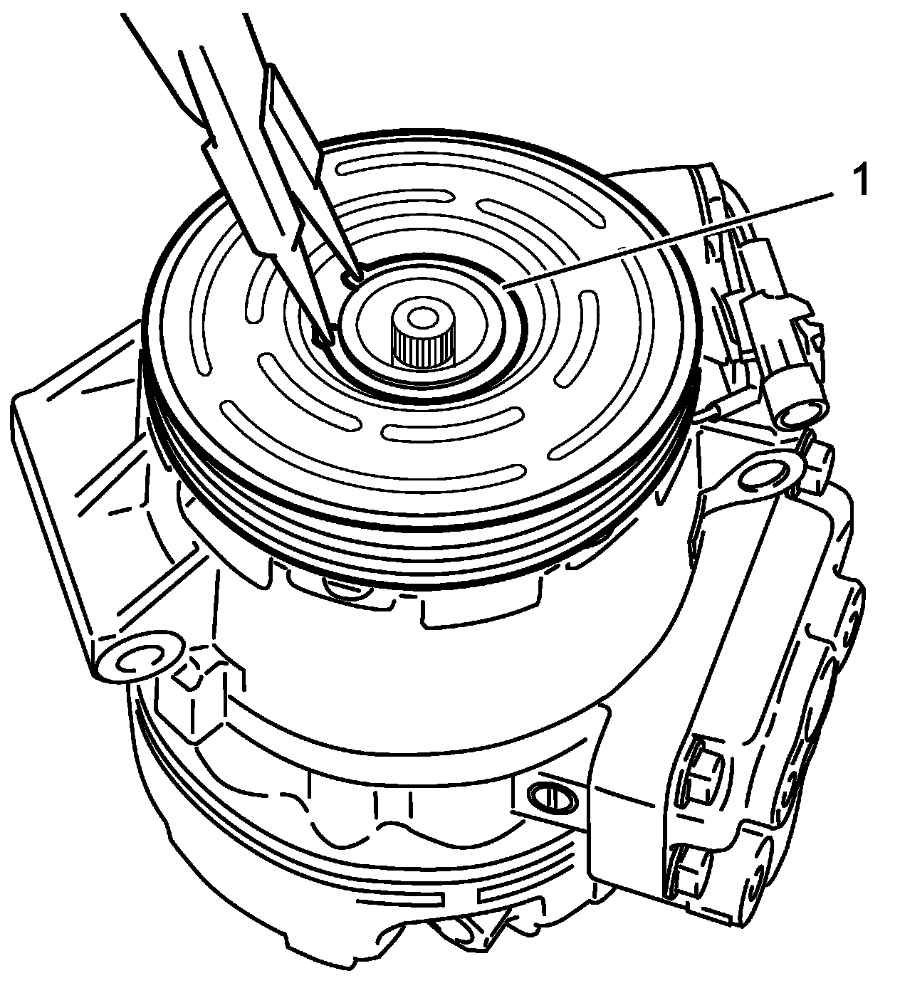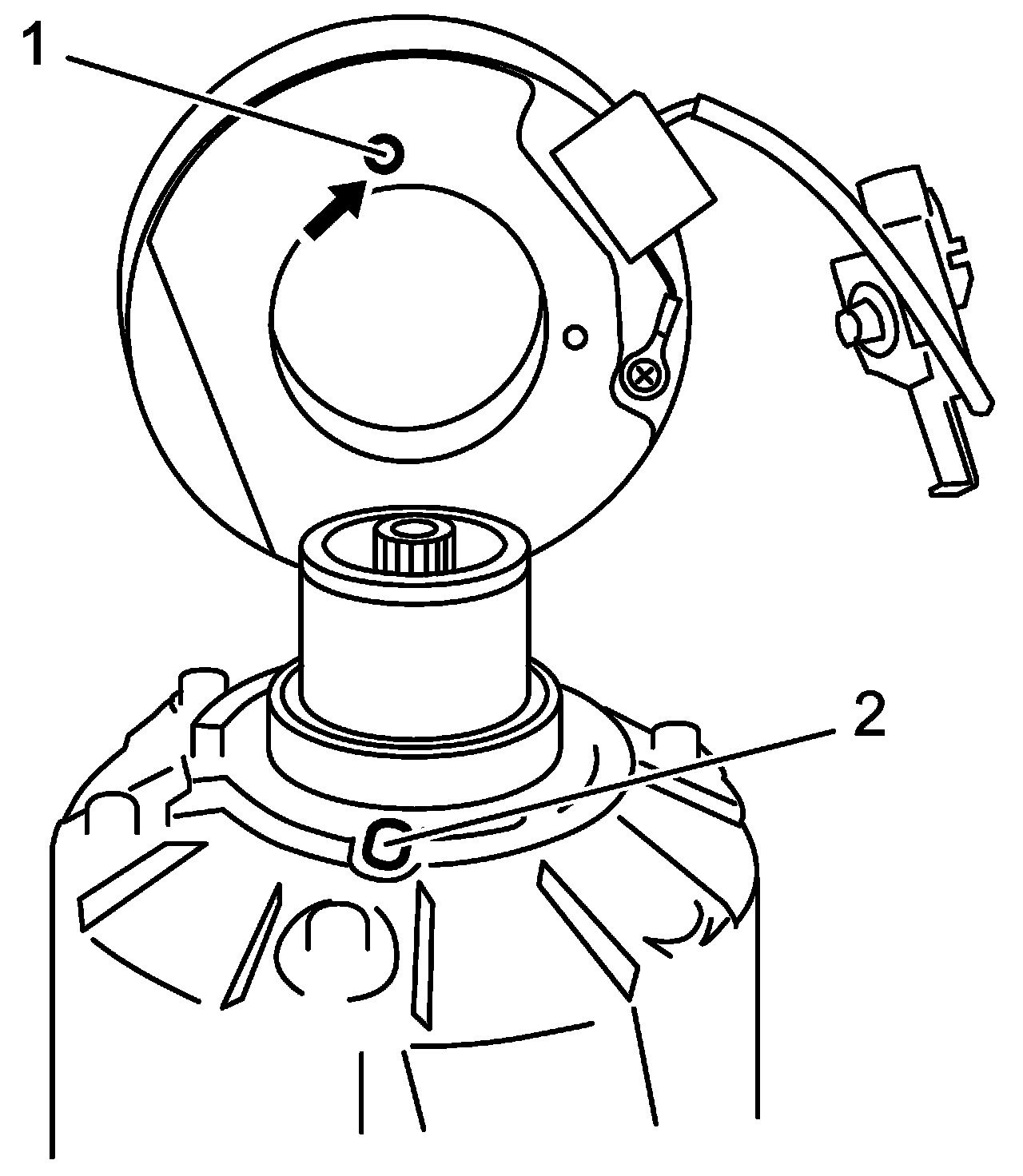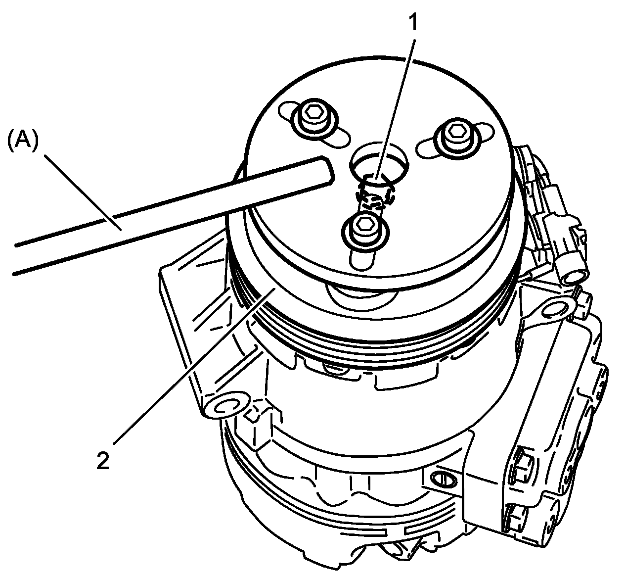 NOTE: Protrusion (1) on underside of magnet clutch coil and hole (2) on compressor body assembly must match to stop movement of magnet clutch coil and to locate lead wire correctly.