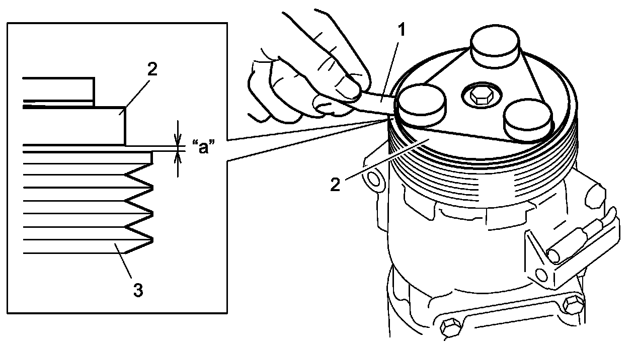 6. Check clearance between armature plate (2) and magnet clutch pulley (3) using thickness gauge (1). If clearance is out of specification, adjust clearance by putting shim(s) on compressor shaft.