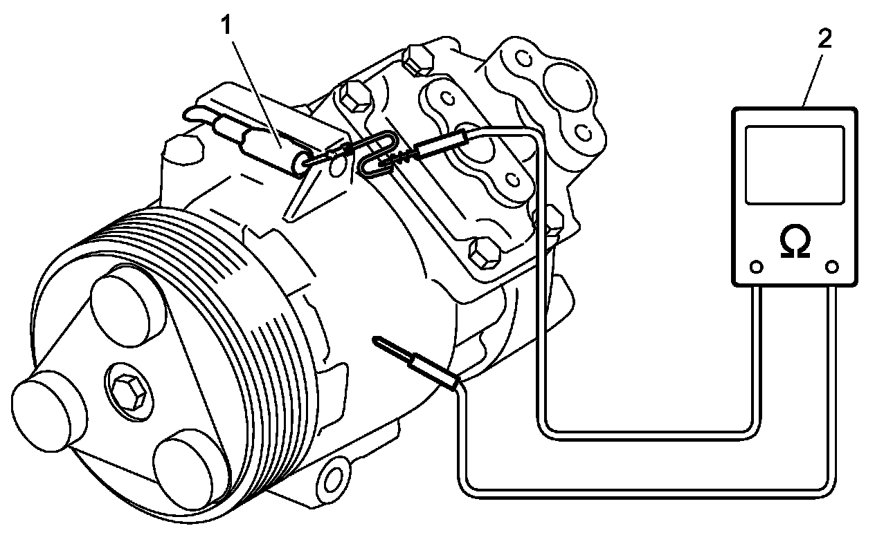 - Using an ohmmeter (2), measure resistance of stator coil between clutch lead wire (1) and compressor body.