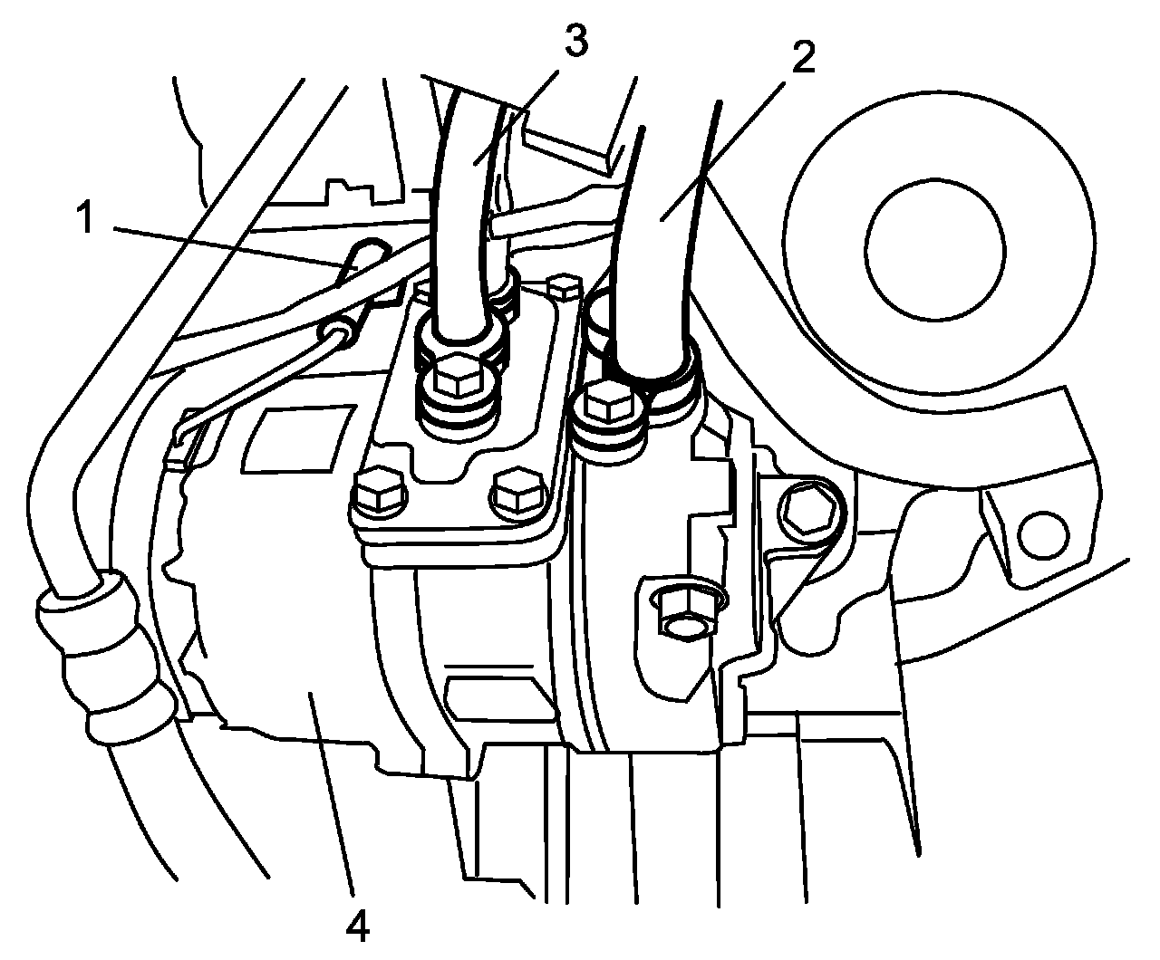 9. Disconnect suction hose (2) and discharge hose (3) from compressor.