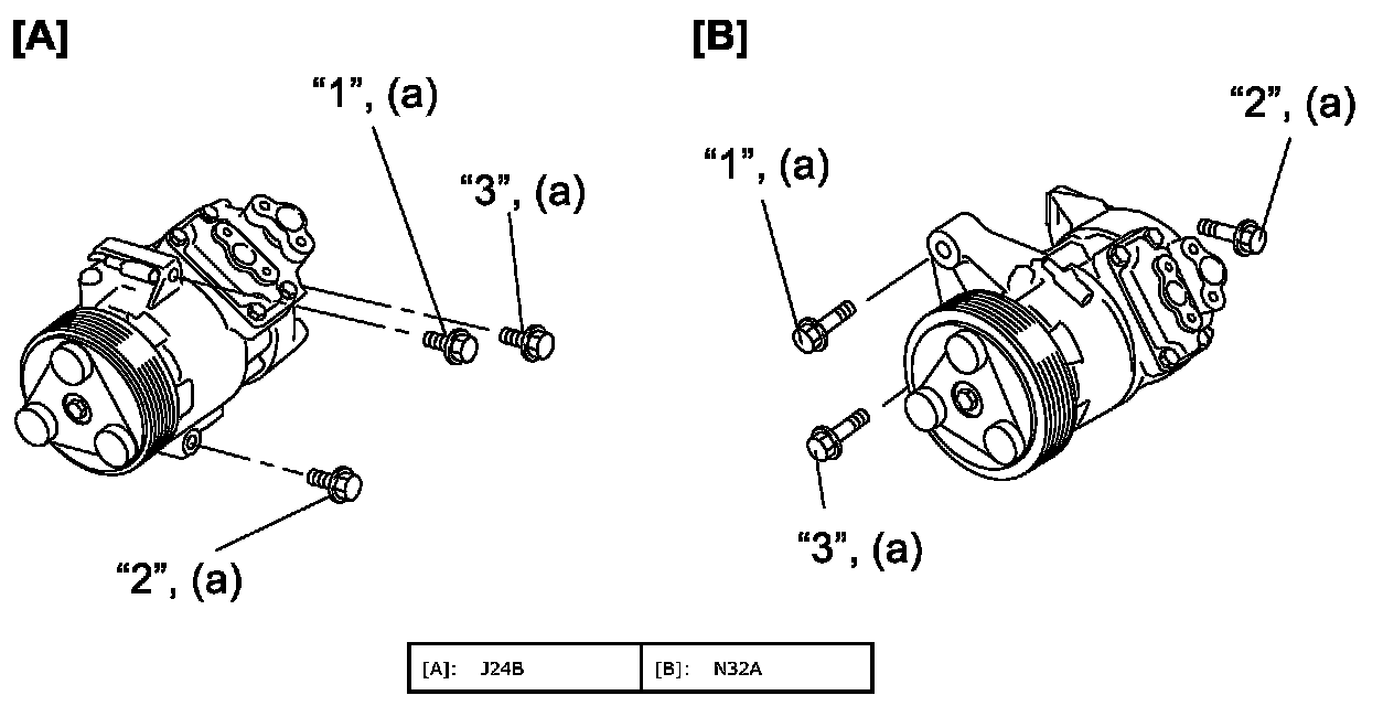 - Tighten compressor mounting bolts "2" temporarily and install mounting bolt "1" and "3", and then tighten mounting bolts in numerical order ("1" through "3") to specified torque as shown in figure. (N32A model)