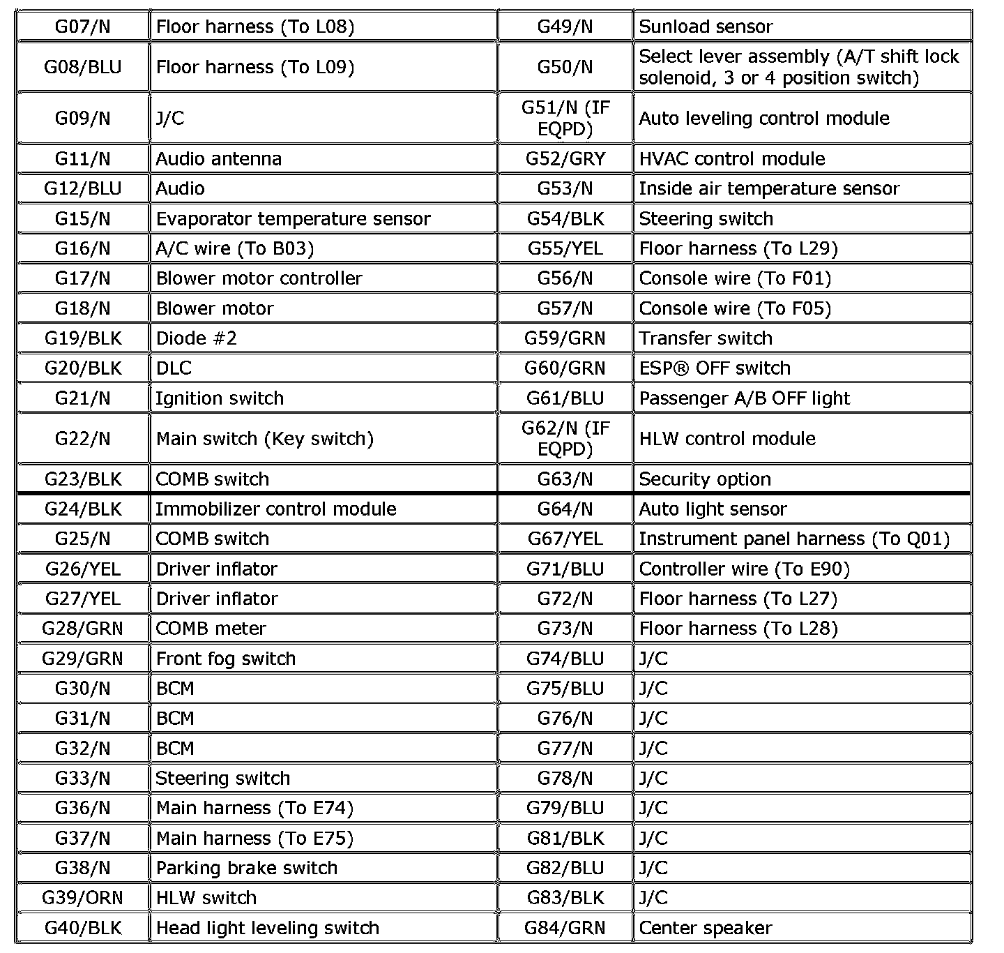 G: Instrument Panel Harness Index (Part 2):