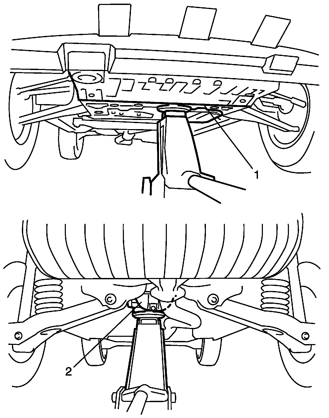 In raising front or rear vehicle end off the floor by jacking, be sure to put the jack against the center portion of the front suspension frame (1) or rear differential (2).
