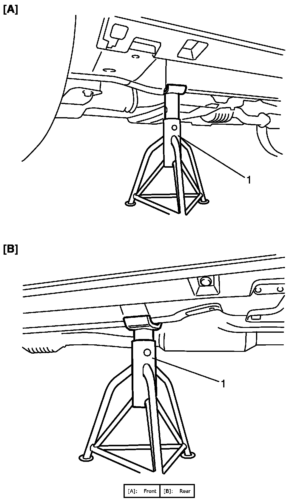 To perform service with either front or rear vehicle end jacked up, be sure to place safety stands (1) under chassis frame so that body is securely supported.