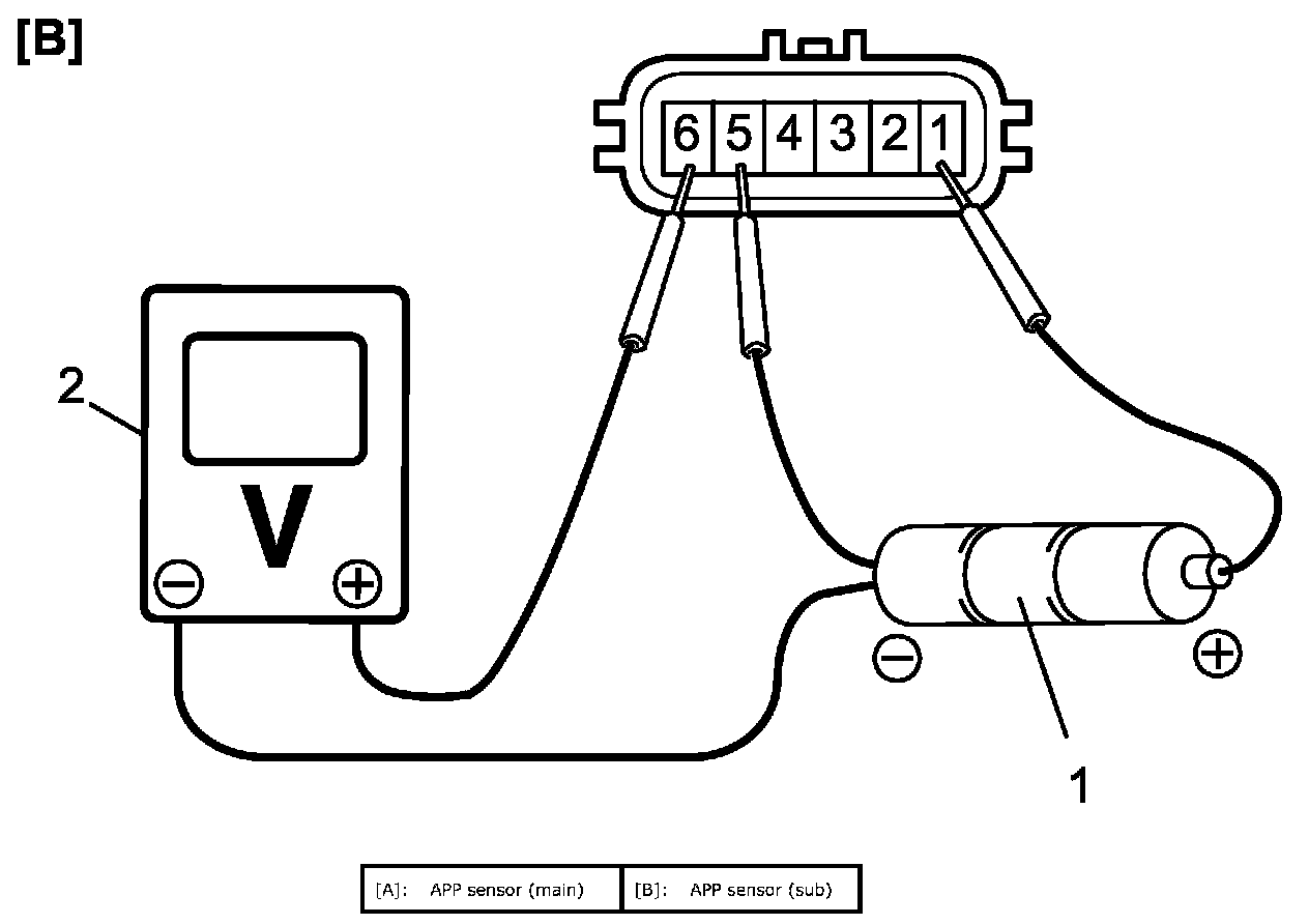 b. Connect voltmeter (2) and batteries to APP sensor as shown in figure.