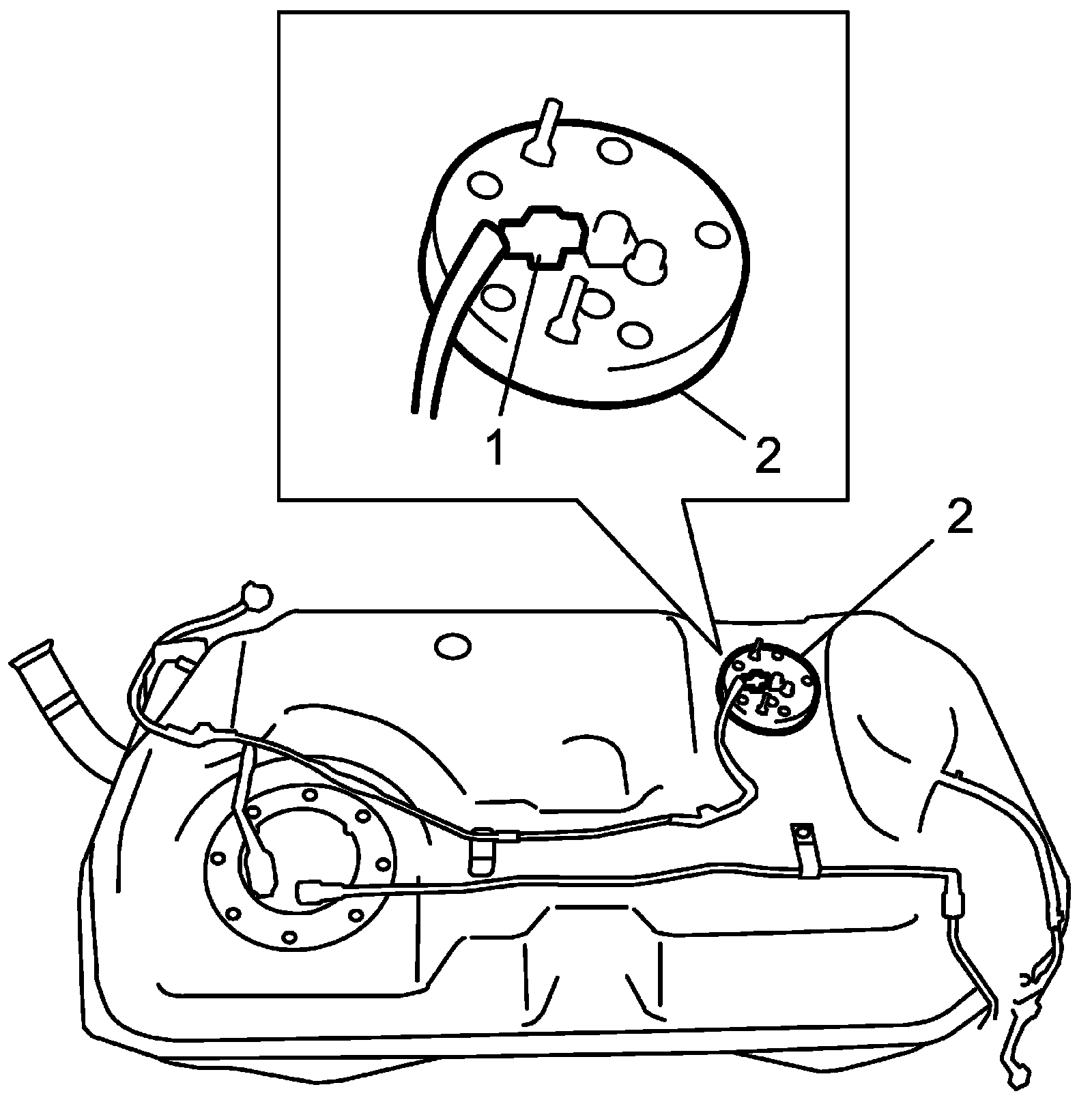 Sub Fuel Level Sensor Removal and InstallationCAUTION: Do not touch resister plate (1) and deform arm (2). It may cause sub fuel level sensor to fail.