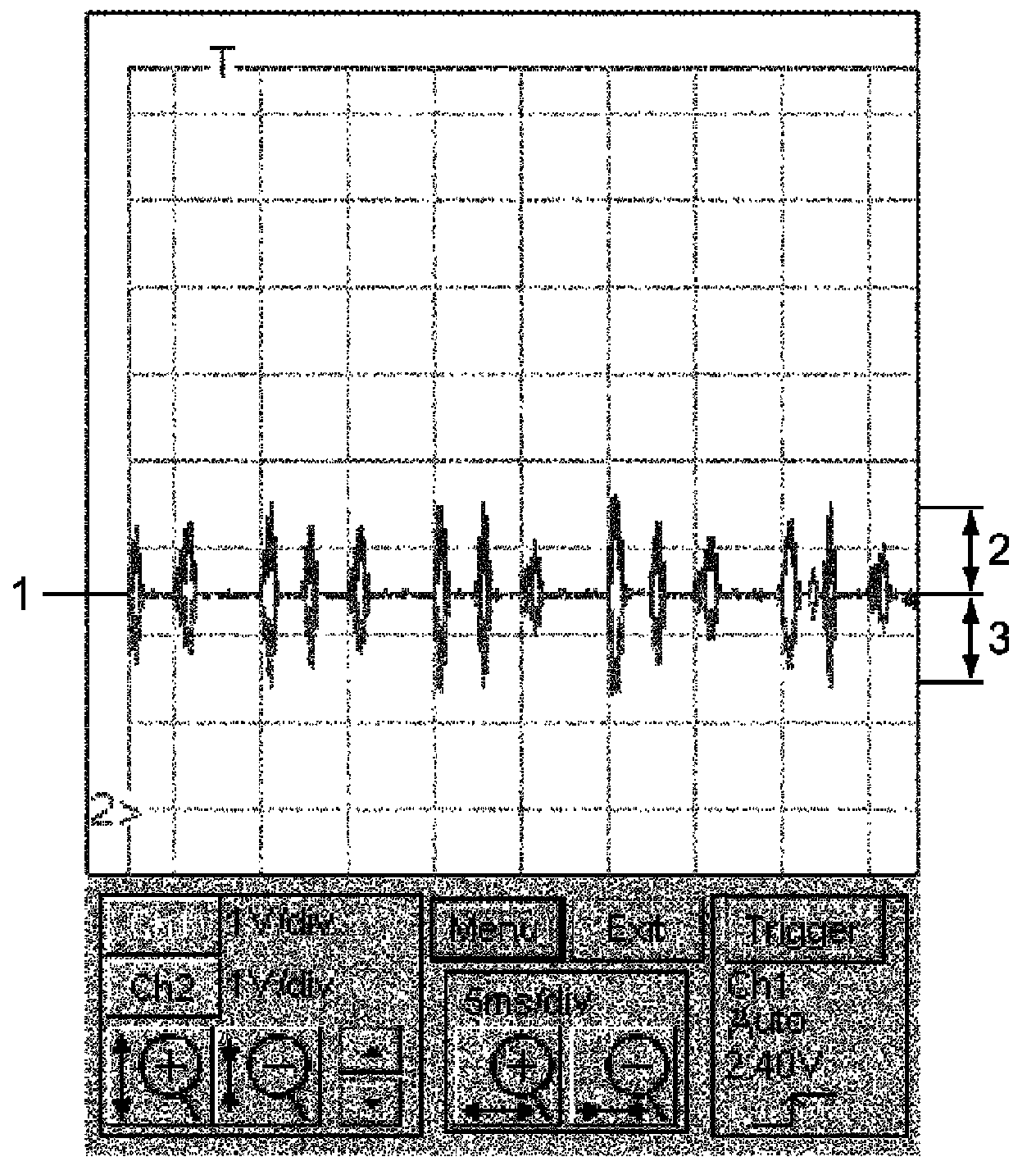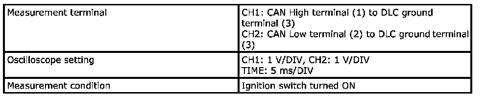 Reference voltage level of CAN High signal and CAN Low signal is unstable and tends to indicate a lower value than in the normal state (2.5 V) (1). Also, waveform of CAN High signal oscillates irregularly (3) but that of CAN Low signal is almost constant (2).