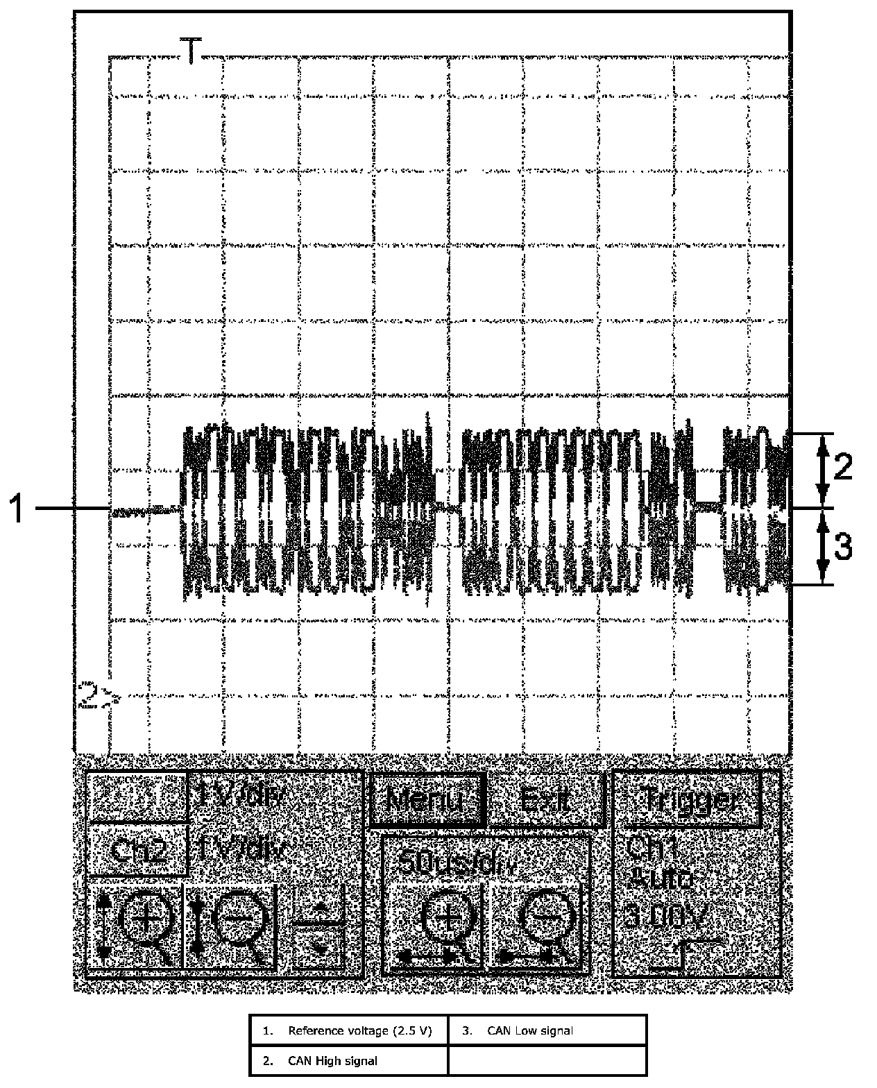 Reference voltage (1) is 5 V for both CAN High signal and CAN Low signal. Waveform of CAN High signal oscillates irregularly near 5 V (3) and that of CAN Low signal between 5 V and 2 V (4).