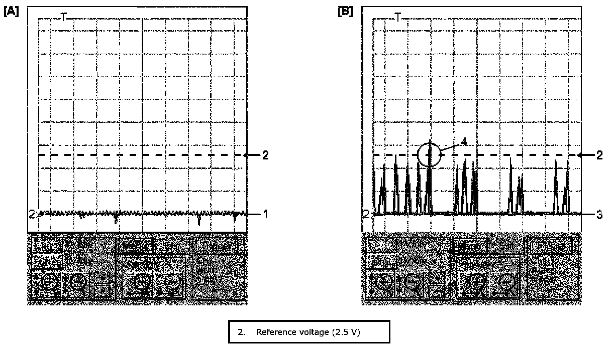 Reference level of both CAN High signal and CAN Low signal is GND level (0 V). Waveform of CAN High signal oscillates irregularly (4) between 0 V and 3 V and that of CAN Low signal is fixed to 0 V (3).