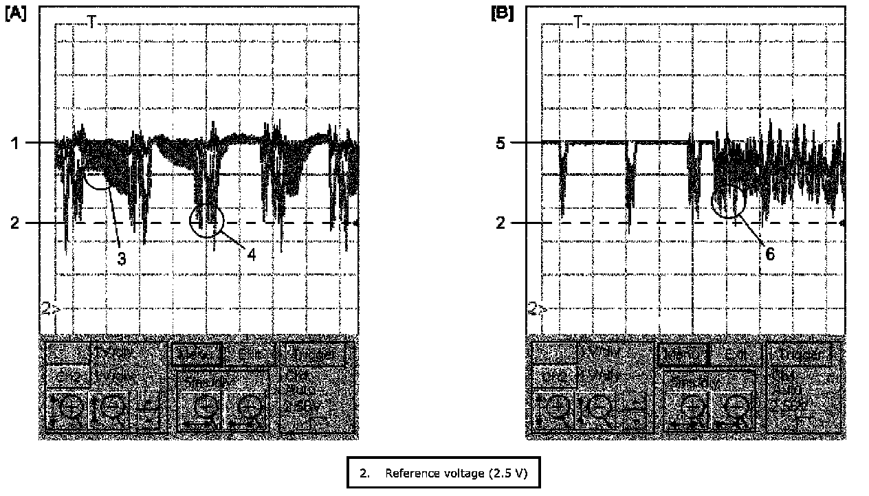 Reference voltage level of CAN High signal and CAN Low signal is unstable and tends to indicate a higher value than in the normal state (2.5 V) (4). Also, waveform of CAN High signal is almost constant (5) but that of CAN Low signal oscillates irregularly (6).