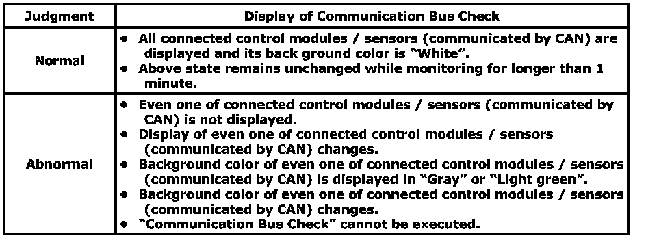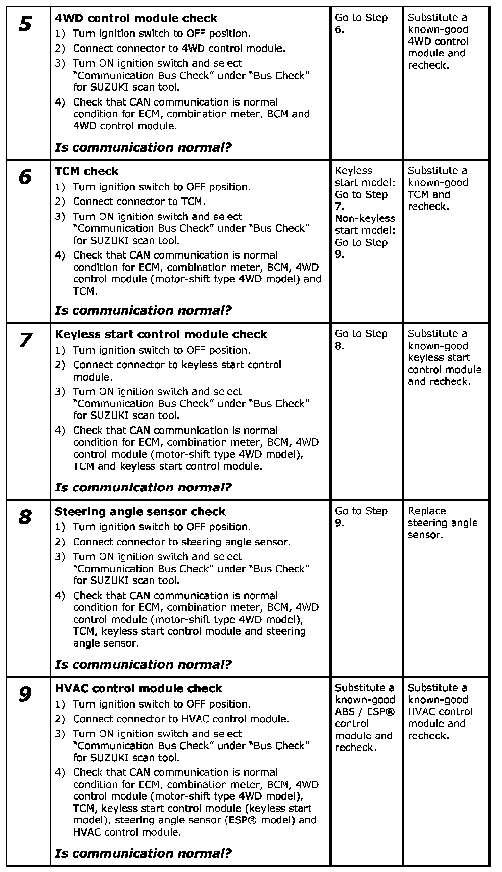- When performing "Communication Bus Check" using SUZUKI scan tool (SUZUKI SDT) in each step of this troubleshooting, use the following table to determine whether the control module is in good condition or not.