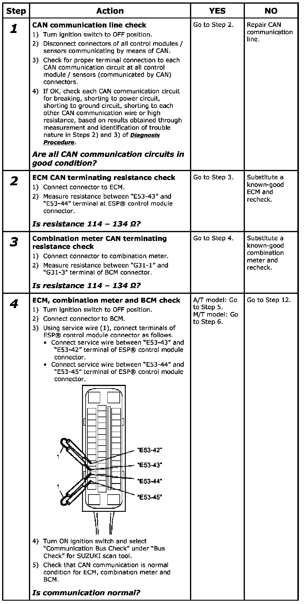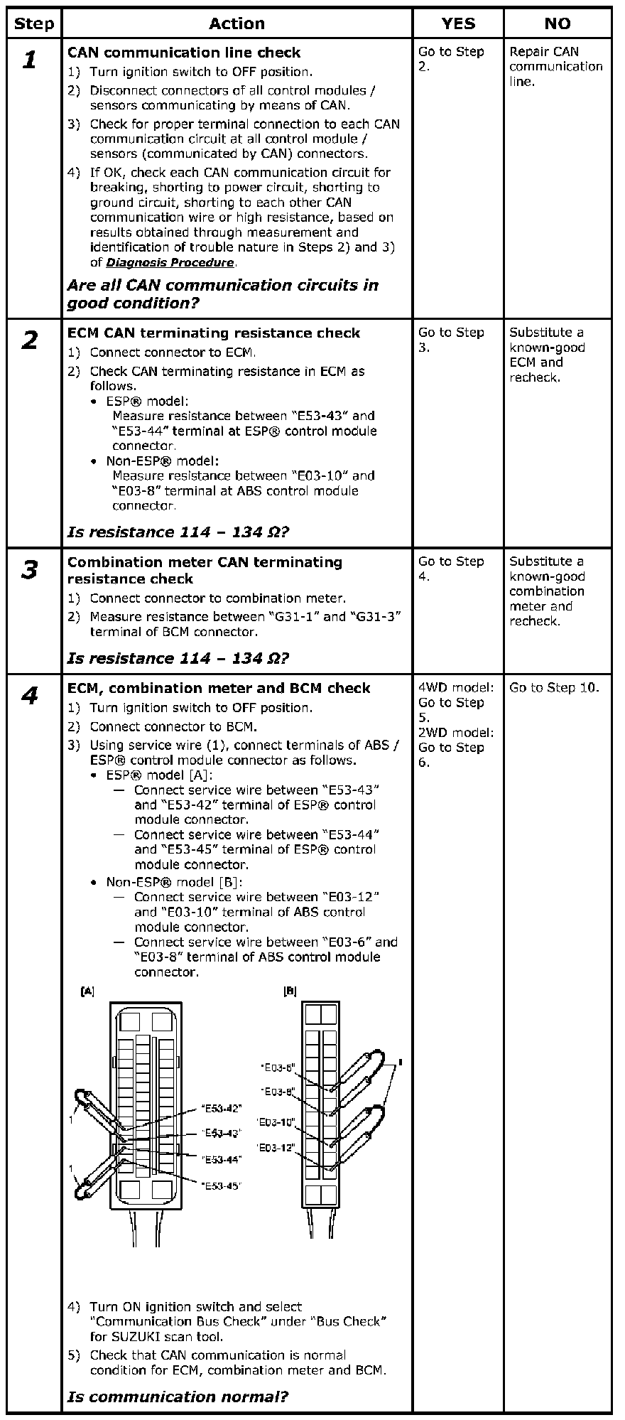 When "CAN Communication Bus Off" is detected in any control modules, or when it is not possible to communicate with any control modules by using SUZUKI scan tool (SUZUKI SDT), perform inspection using the following procedure.