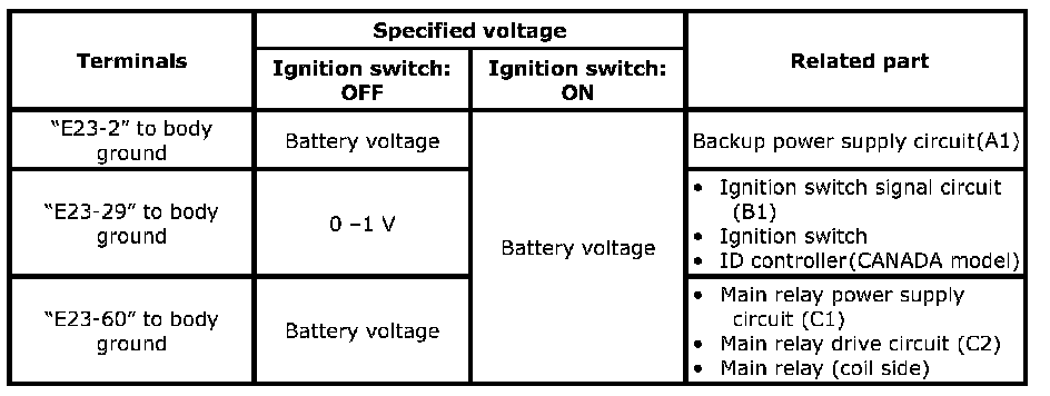 c. Measure voltage between each terminal of ECM connector and body ground in the following table.