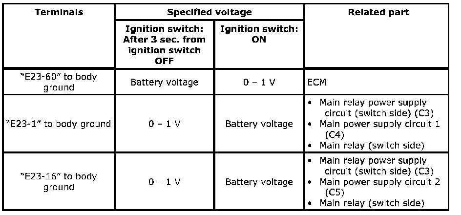 - Be sure to confirm related fuses of ECM power circuit for not blown out. If fuse is blown out, replace fuse(s) and check circuits connected to blown fuse(s) for short circuit to ground.