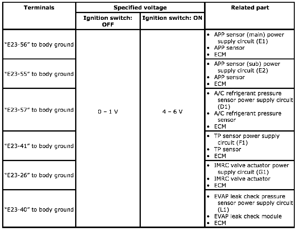 e. Measure voltage between each terminal of ECM connector and body ground in the following table.
