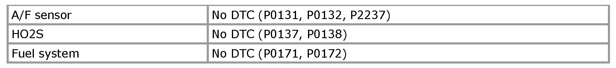 The ECM monitors the A/F sensor characteristic offset by monitoring the feedback condition of HO2S. When the sum of correction factor of HO2S system exceeds higher or lower value, the ECM will set DTC.