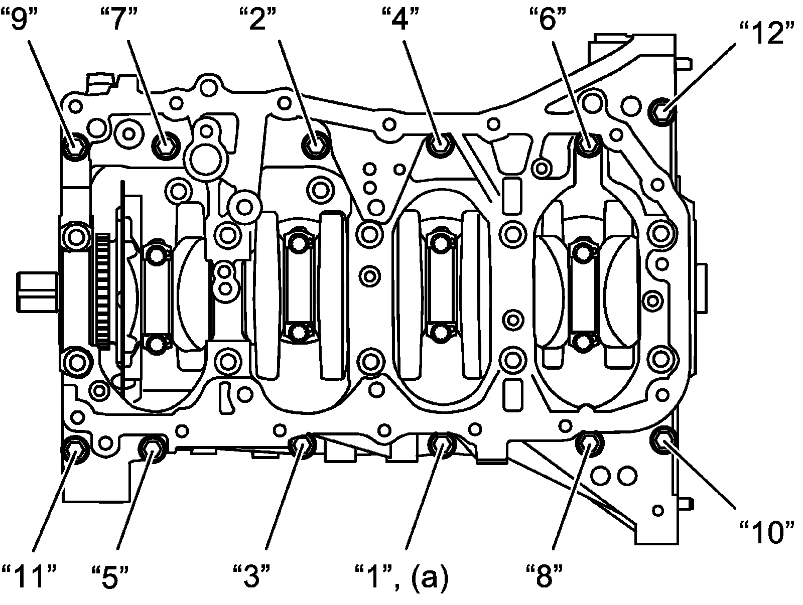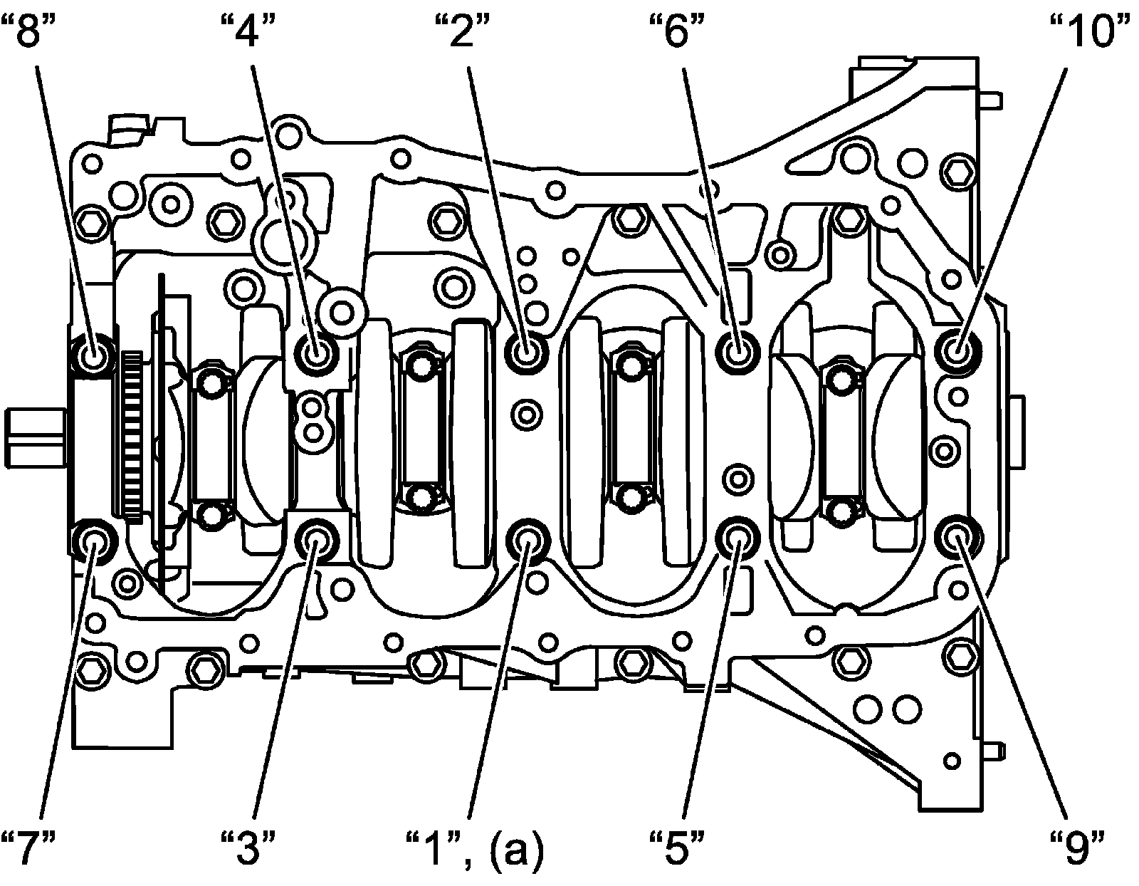 Crank case bolt No.1* 50 Nm -> 0 Nm -> 20 Nm -> 35 Nm -> 40° -> 40° (5.1 kgf-m -> 0 kgf-m -> 2.0 kgf-m -> 3.6 kgf-m -> 40° -> 40 °, 37.0 lbf-ft -> 0 lbf-ft -> 15.0 lbf-ft -> 26.0 lbf-ft -> 40° -> 40°)