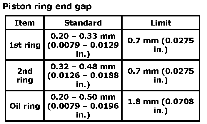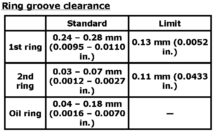 Piston pin clearance in connecting rod small-endStandard: 0.003 - 0.017 mm (0.0002 - 0.0006 in.)