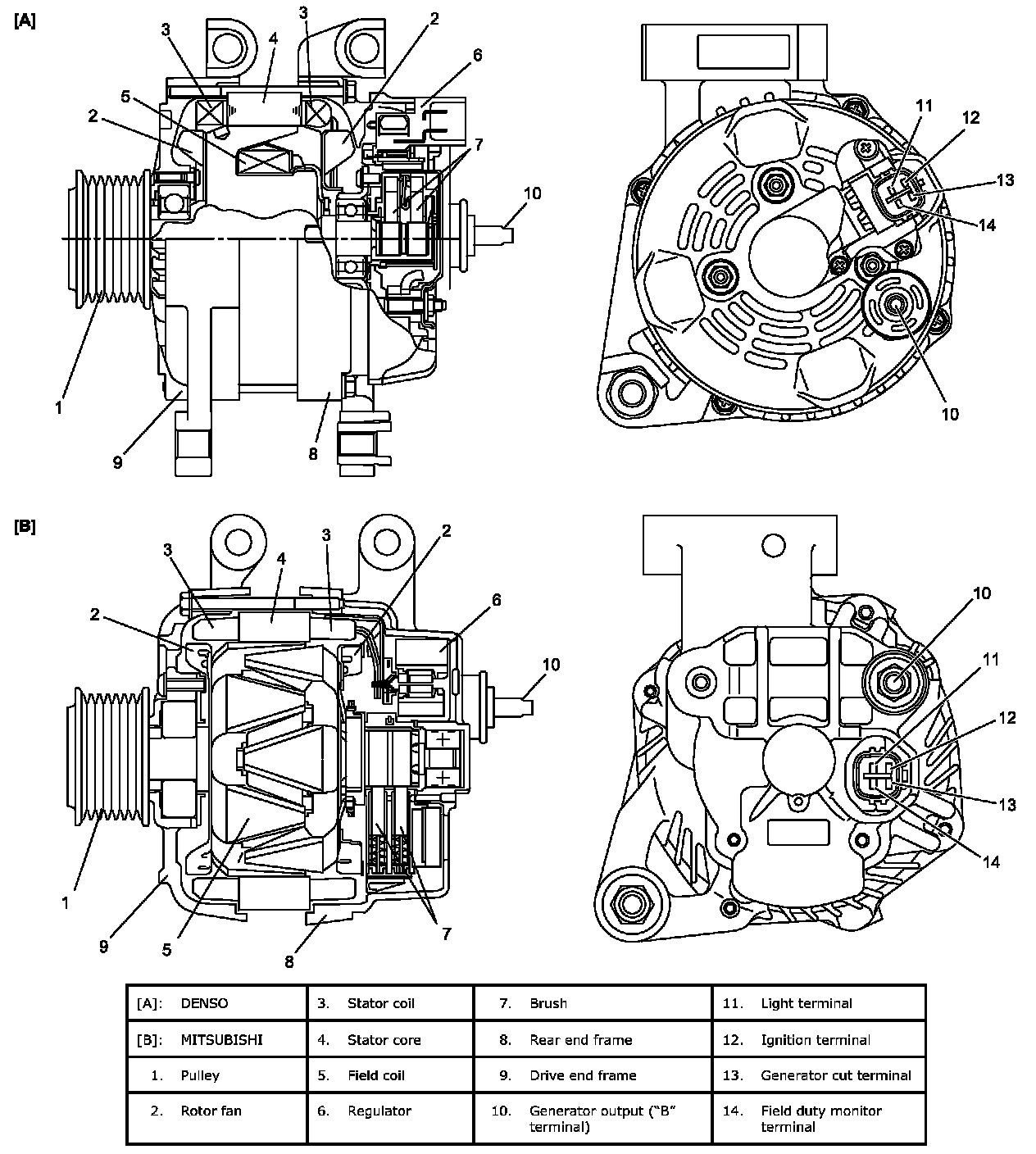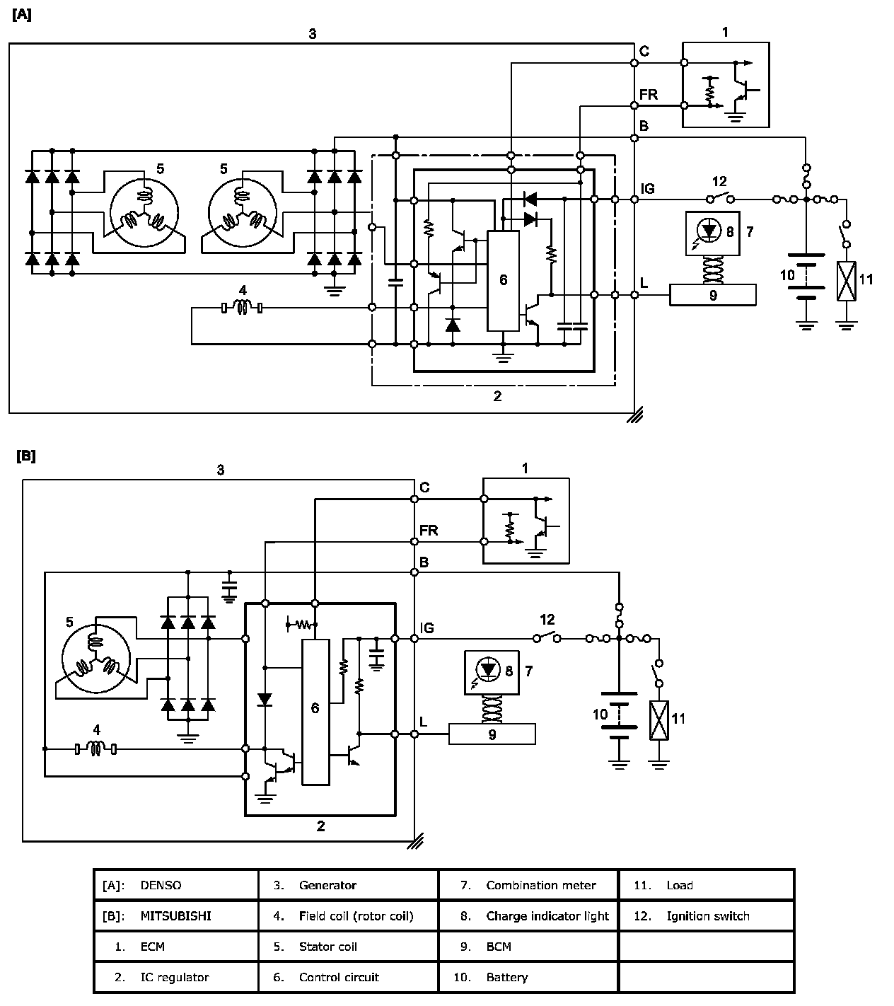 Generator DescriptionThe generator is a small and high performance type with an IC regulator incorporated. The internal components are connected electrically as shown in the following figure.