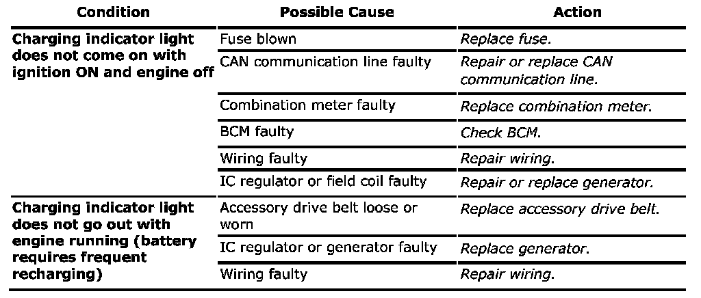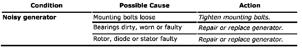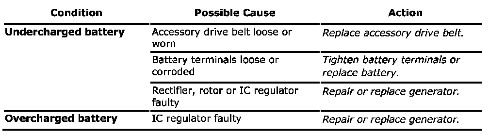 Generator Symptom DiagnosisTrouble in charging system will show up as one or more of the following conditions.