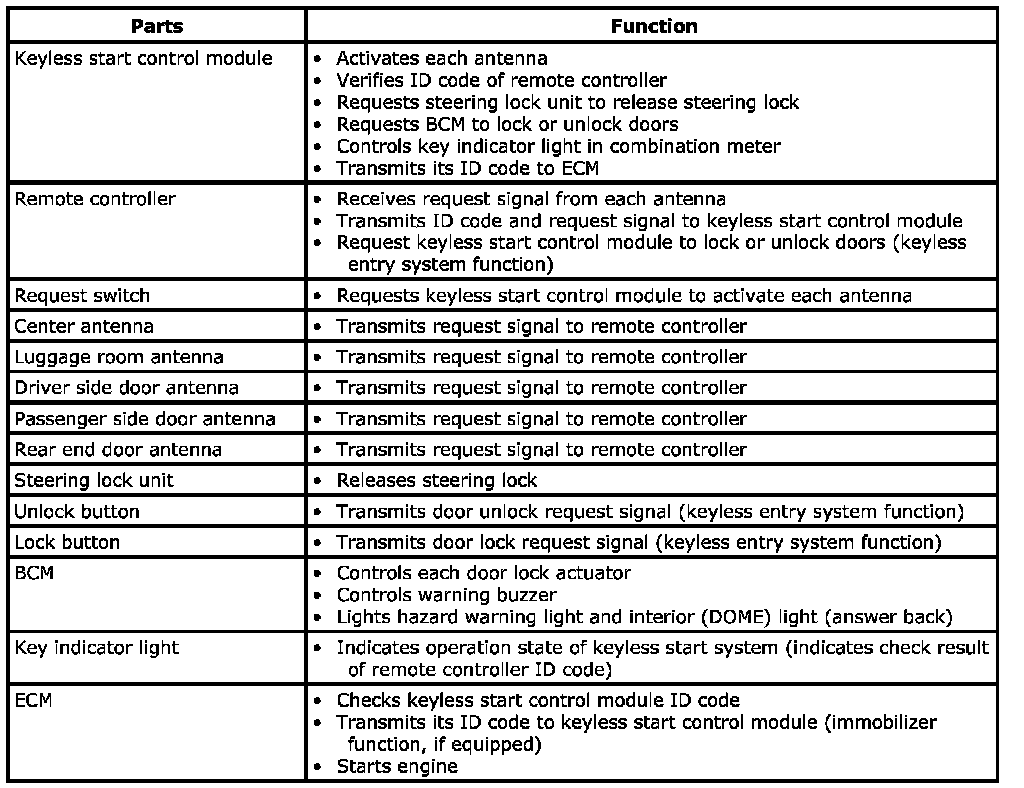 Description of Keyless Start System Parts and Functions