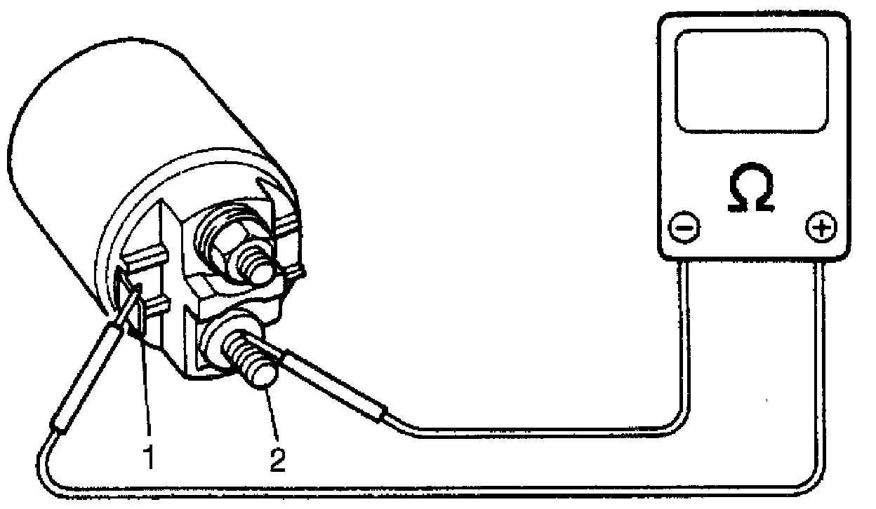 Check for continuity between magnetic switch "S" terminal (1) and "M" terminal (2). If there is no continuity, coil is open and magnetic switch should be replaced.