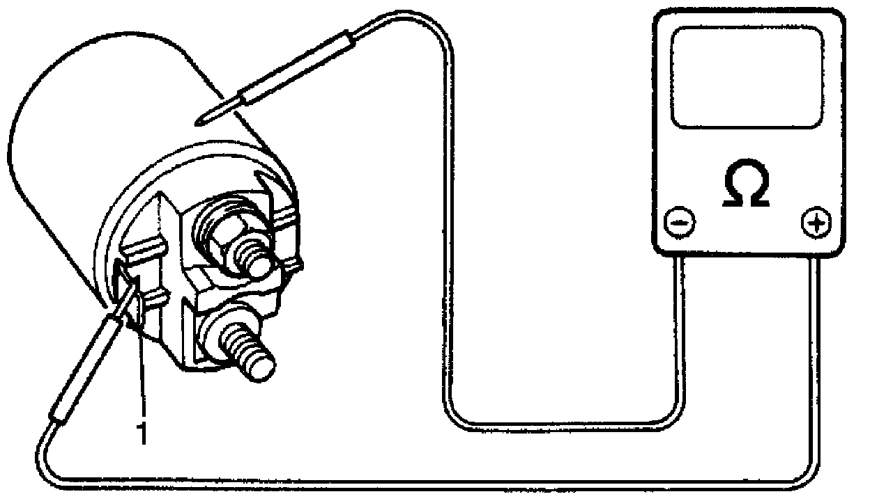 Check for continuity between magnetic switch "S" terminal (1) and coil case. If there is no continuity, coil is open and magnetic switch should be replaced.
