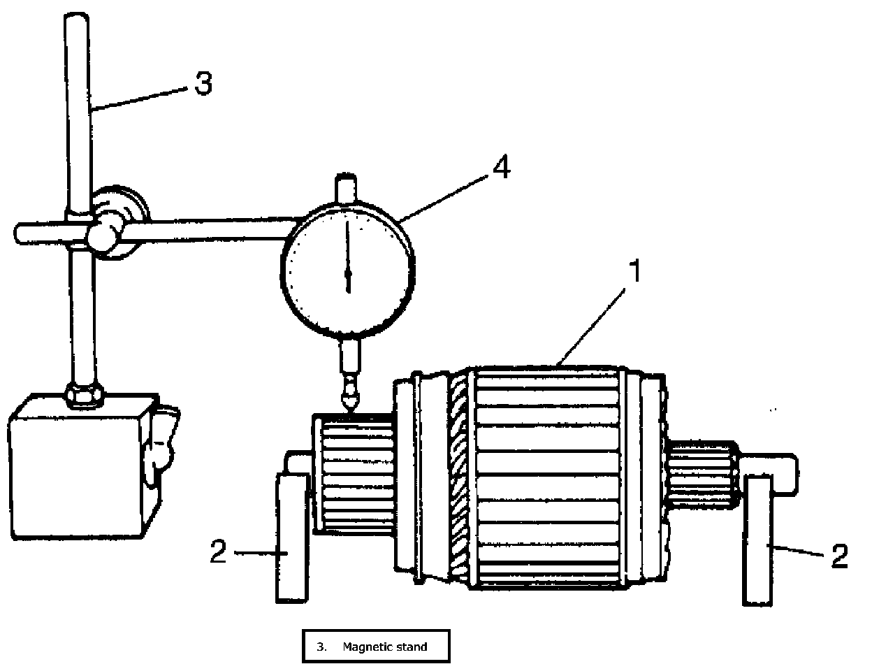 - Check commutator for uneven wear with armature (1) supported on V-blocks (2). If dial gauge (4) deflects exceeding the limit, repair commutator or replace armature.