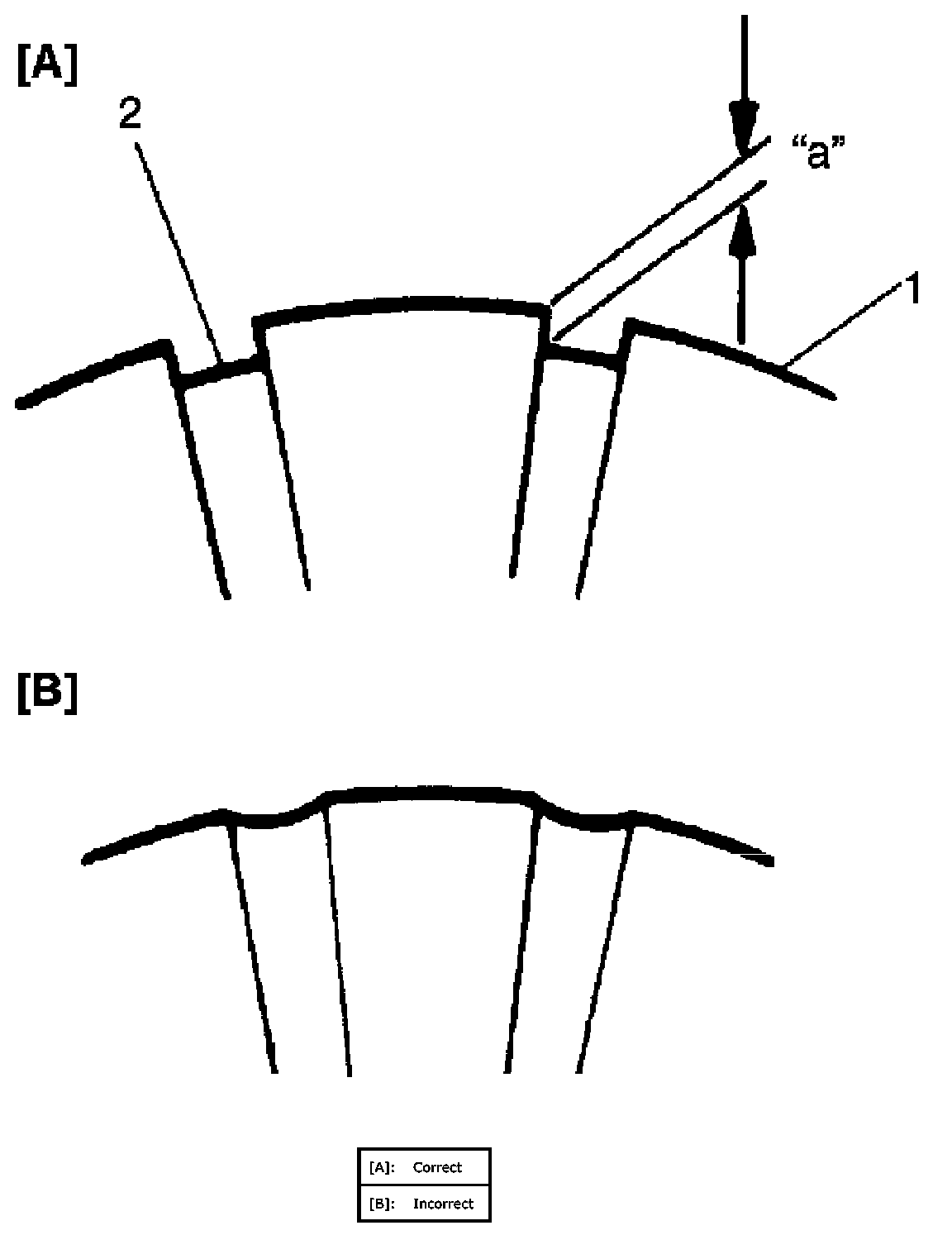 - Check commutator (1) for insulator (2) depth. Correct insulator depth or replace commutator if measurement is below limit.