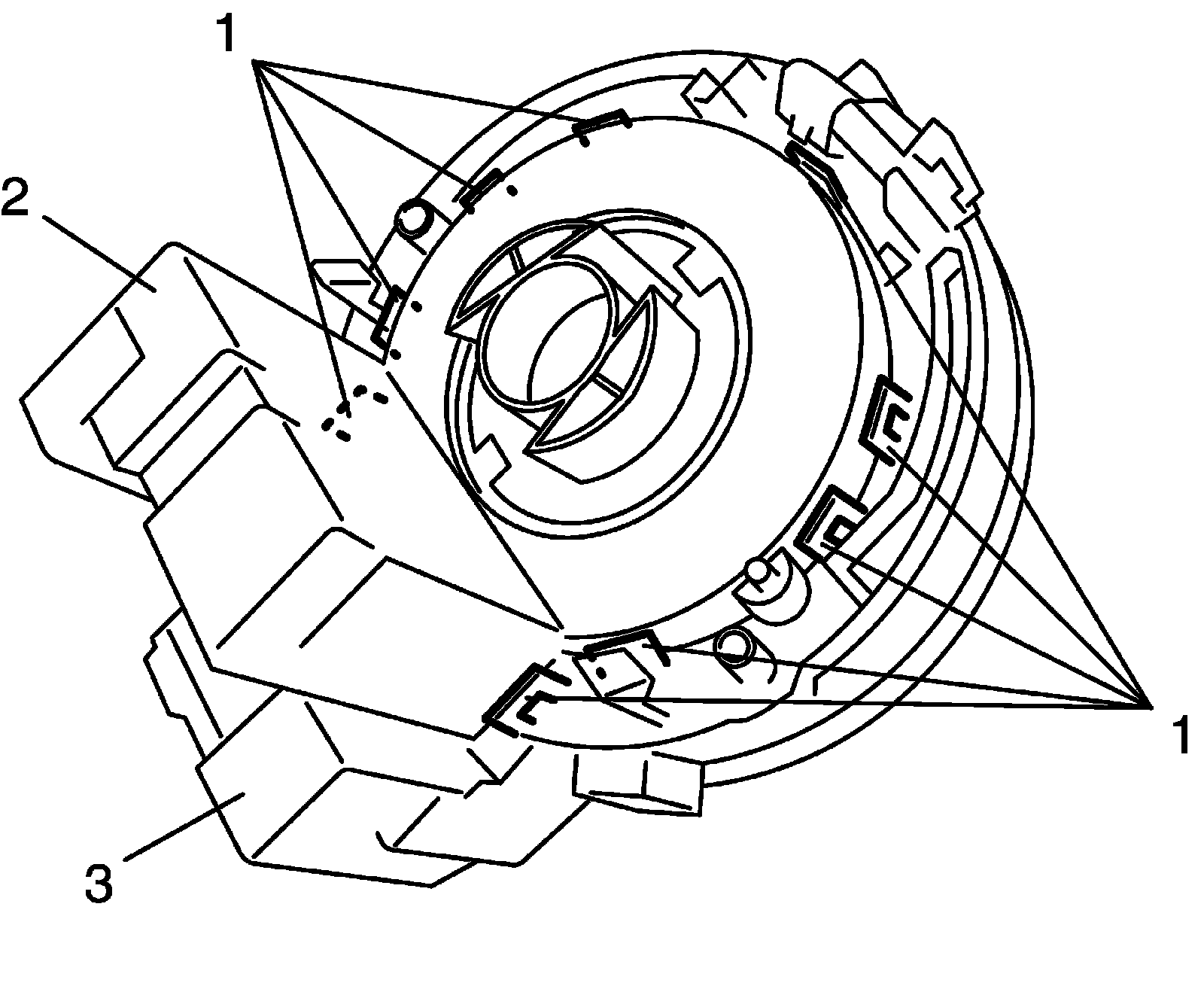 2) Remove steering angle sensor (2) from contact coil cable assembly (3) while opening fitting parts (1) of contact coil cable assembly.