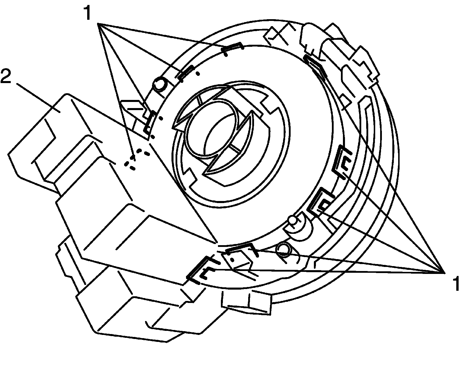 1) Install steering angle sensor (2) by fitting engagement parts (1) of contact coil cable assembly to claws of steering angle sensor as shown in figure.